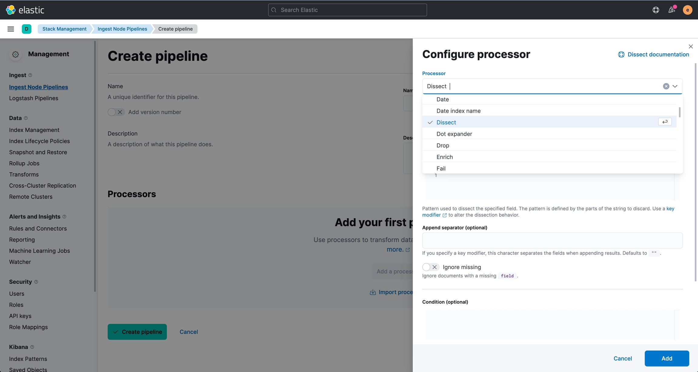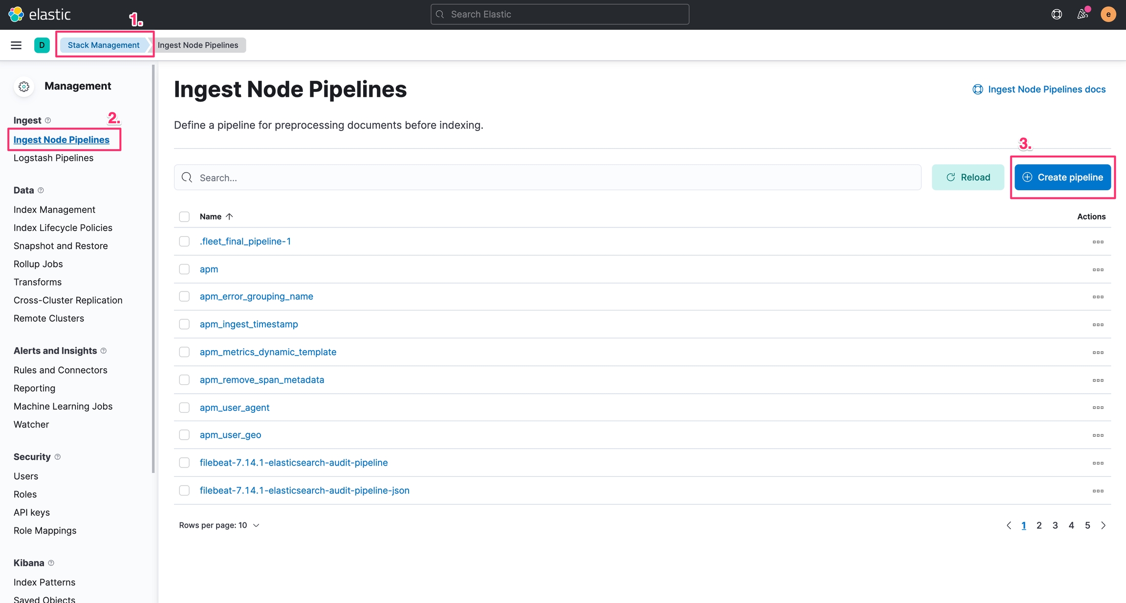 另外 Kibana 也有提供 UI 的設定畫面,可以在 Kibana > Stake Management > Ingest > Ingest Node Pipelines 建立或管理 Ingest Pipeline: