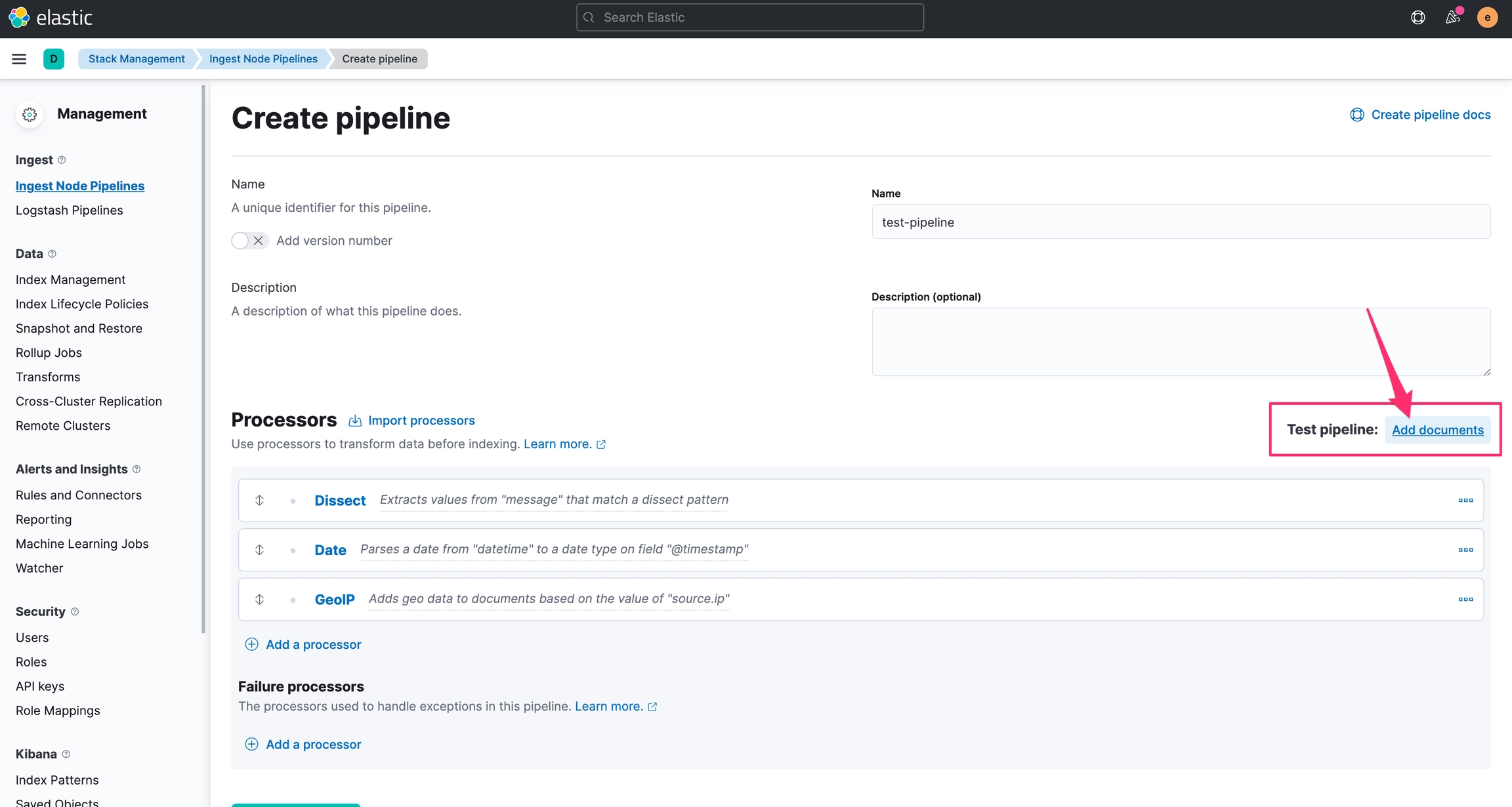 使用 Kibana 的 Test Pipeline