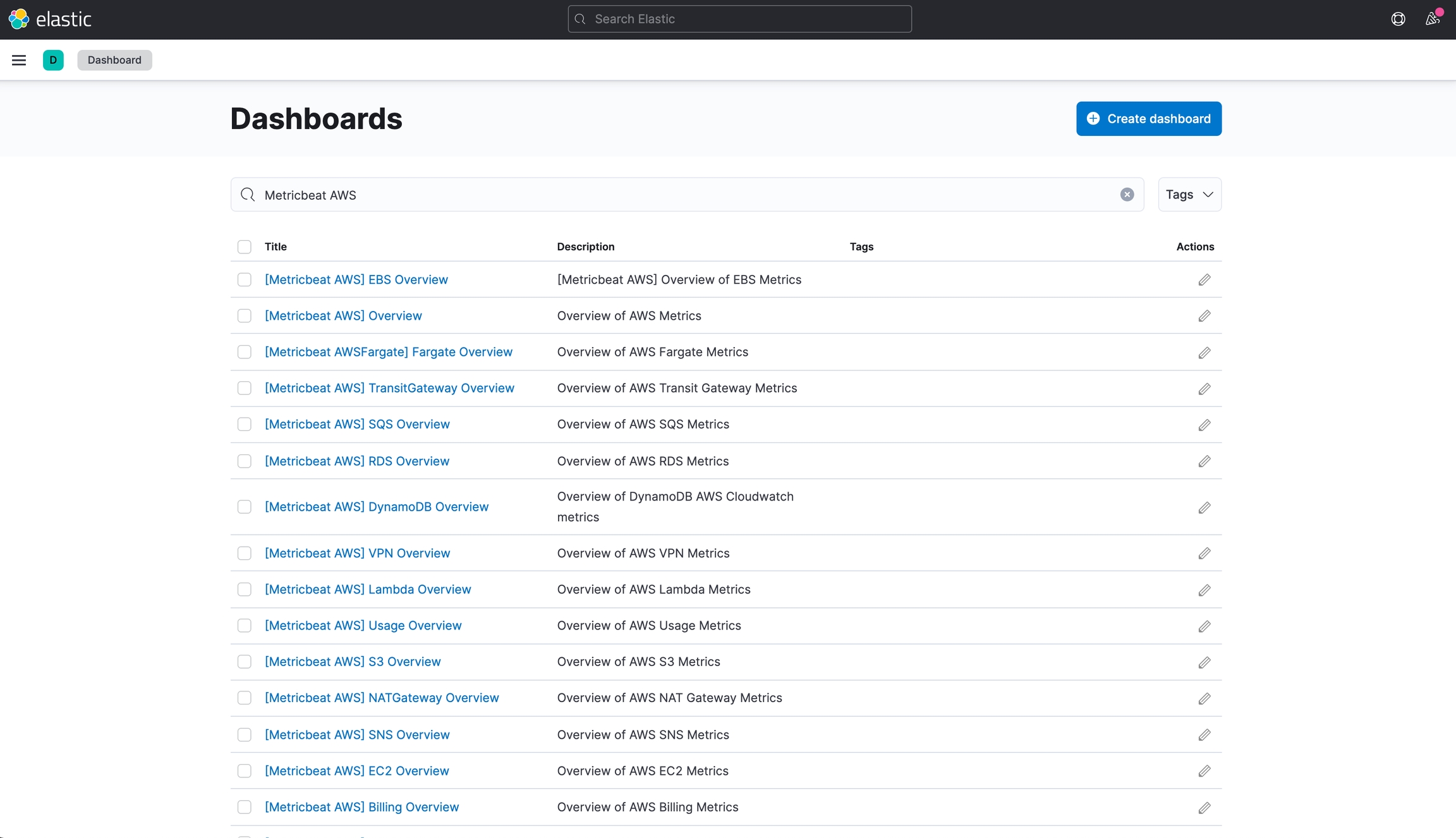 由於 Metricbeat 預設為 AWS 所建立的 Dashboard 非常的多,如先前介紹 metricset 時所描述,建議大家針對你所指定收集的 metricset,可以先查看是否有預先建立好的 Dashboard,或是從 Kibana Dashbard 中,使用 Metricbeat AWS