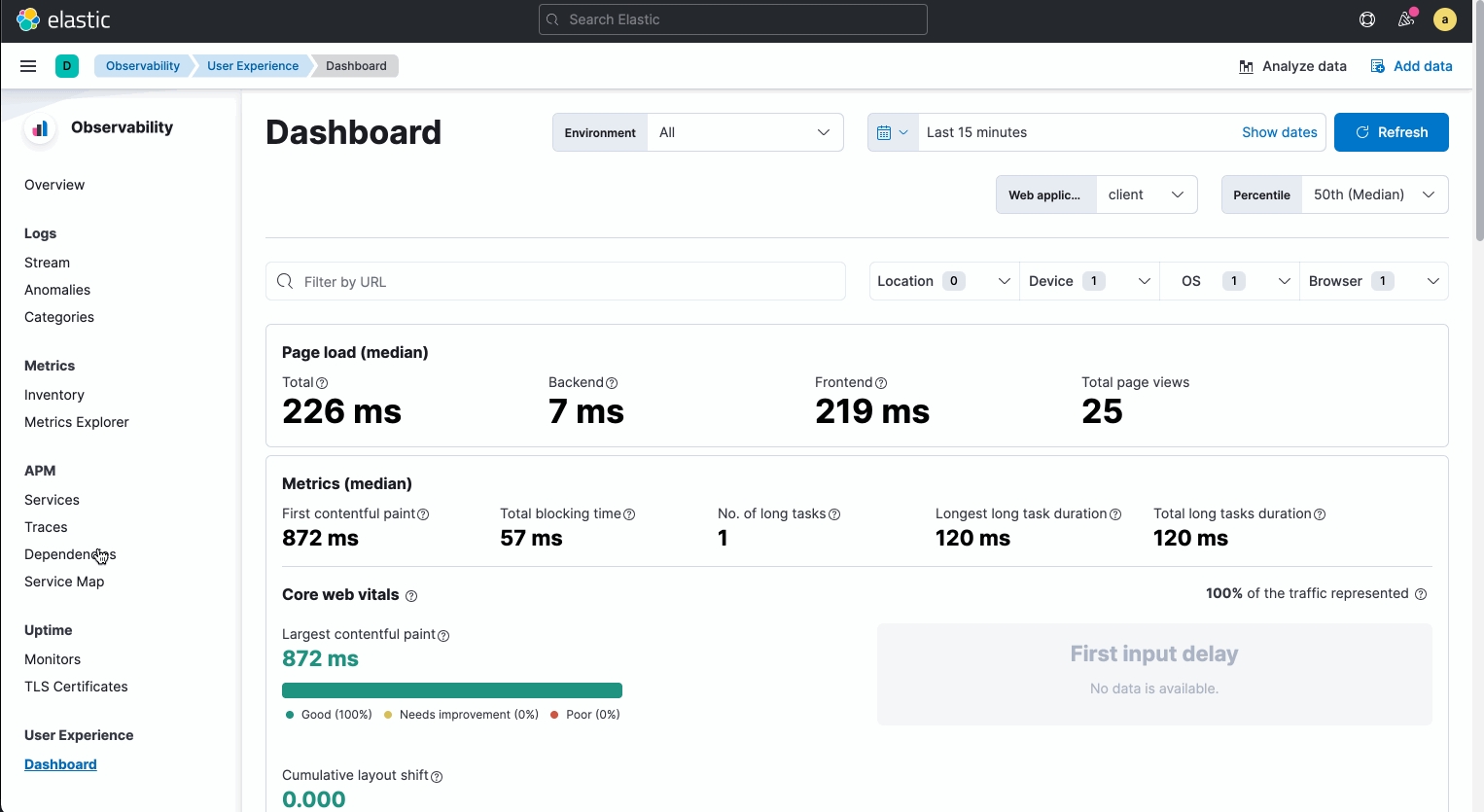 當資料透過 APM Agents 收集進入 Elasticsearch 之後,我們可以直接從 Kibana \ Observability \ User Experience 的功能選單進入專門針對 RUM 建立的 Dashboard。