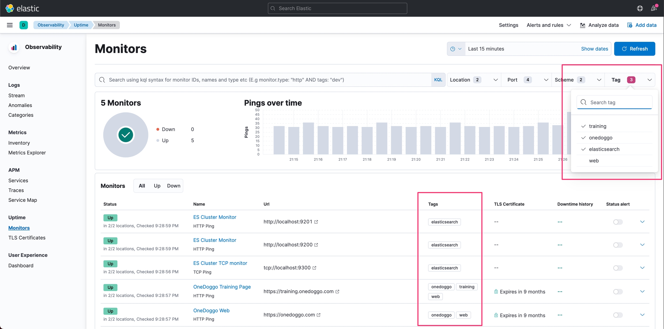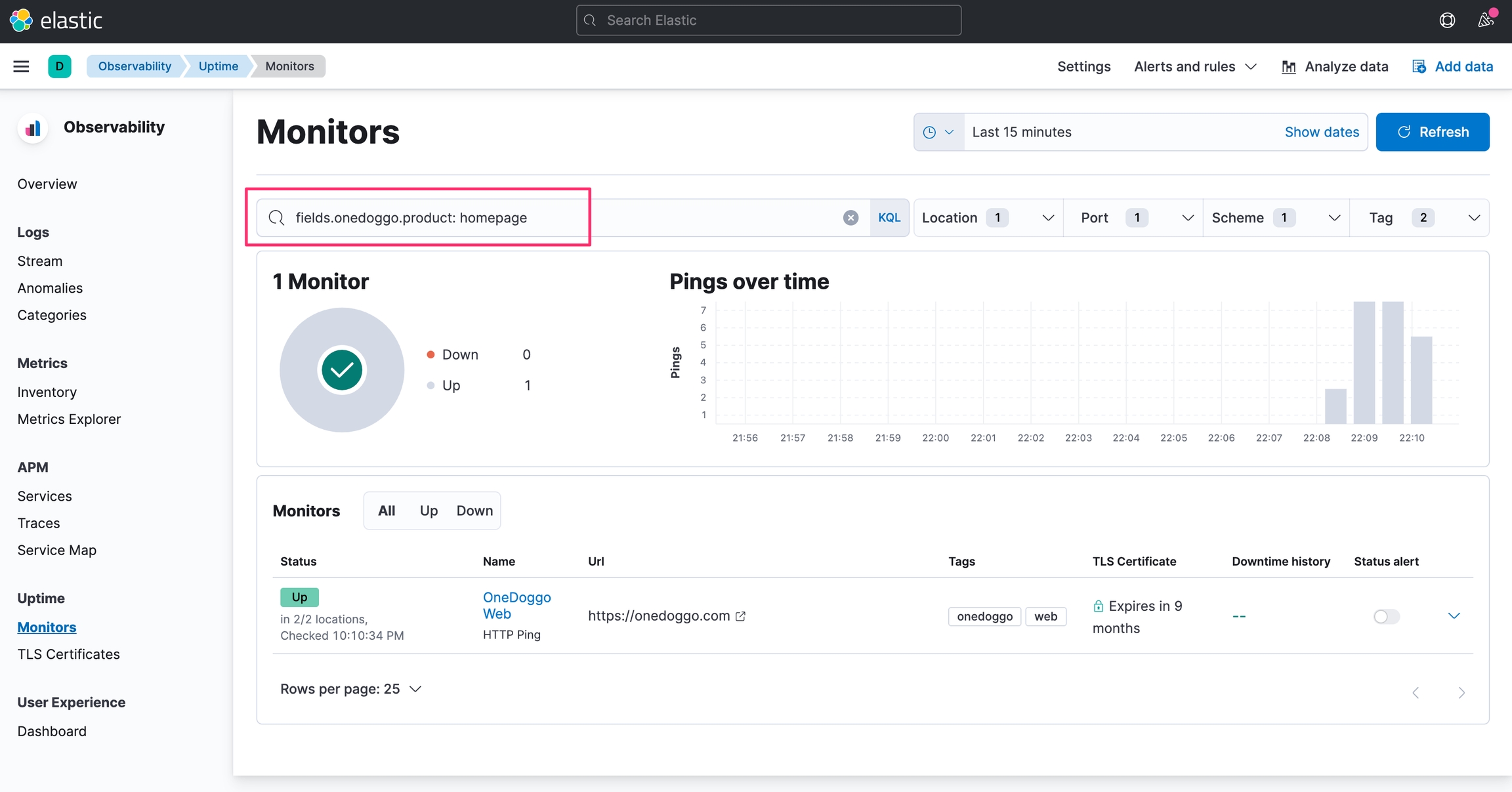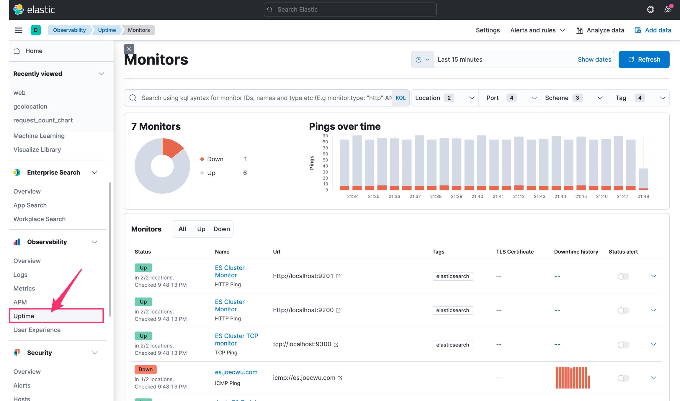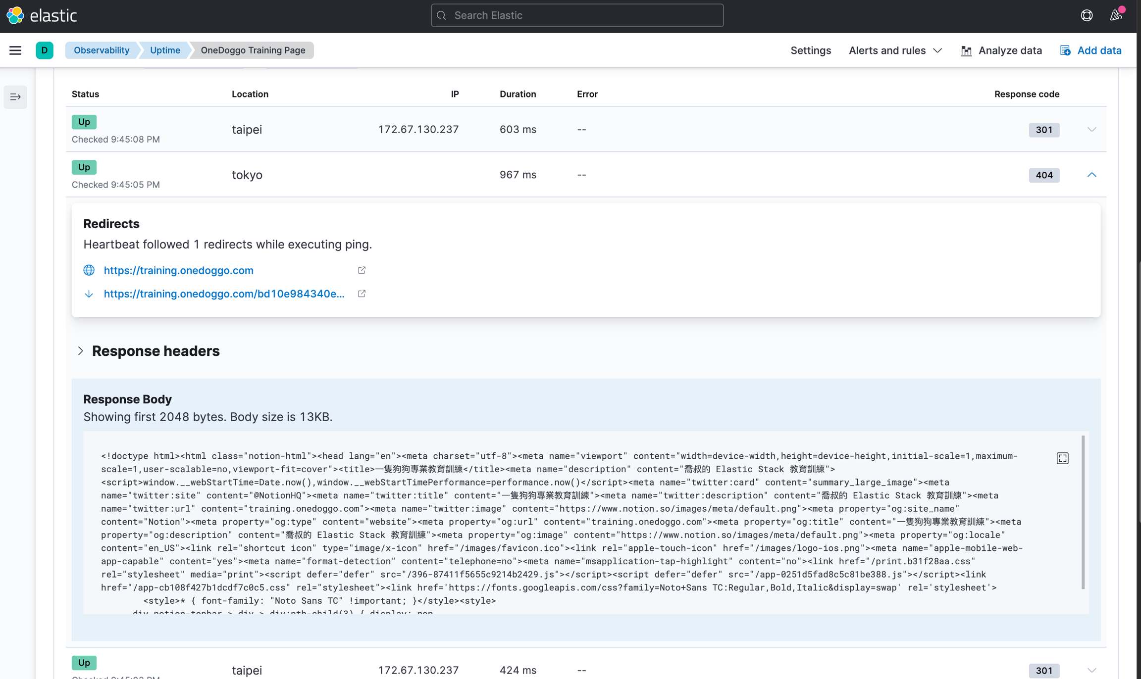 最後可以就可以從 Kibana 的 Observability 選單中的 Uptime 看到收集的資料了。