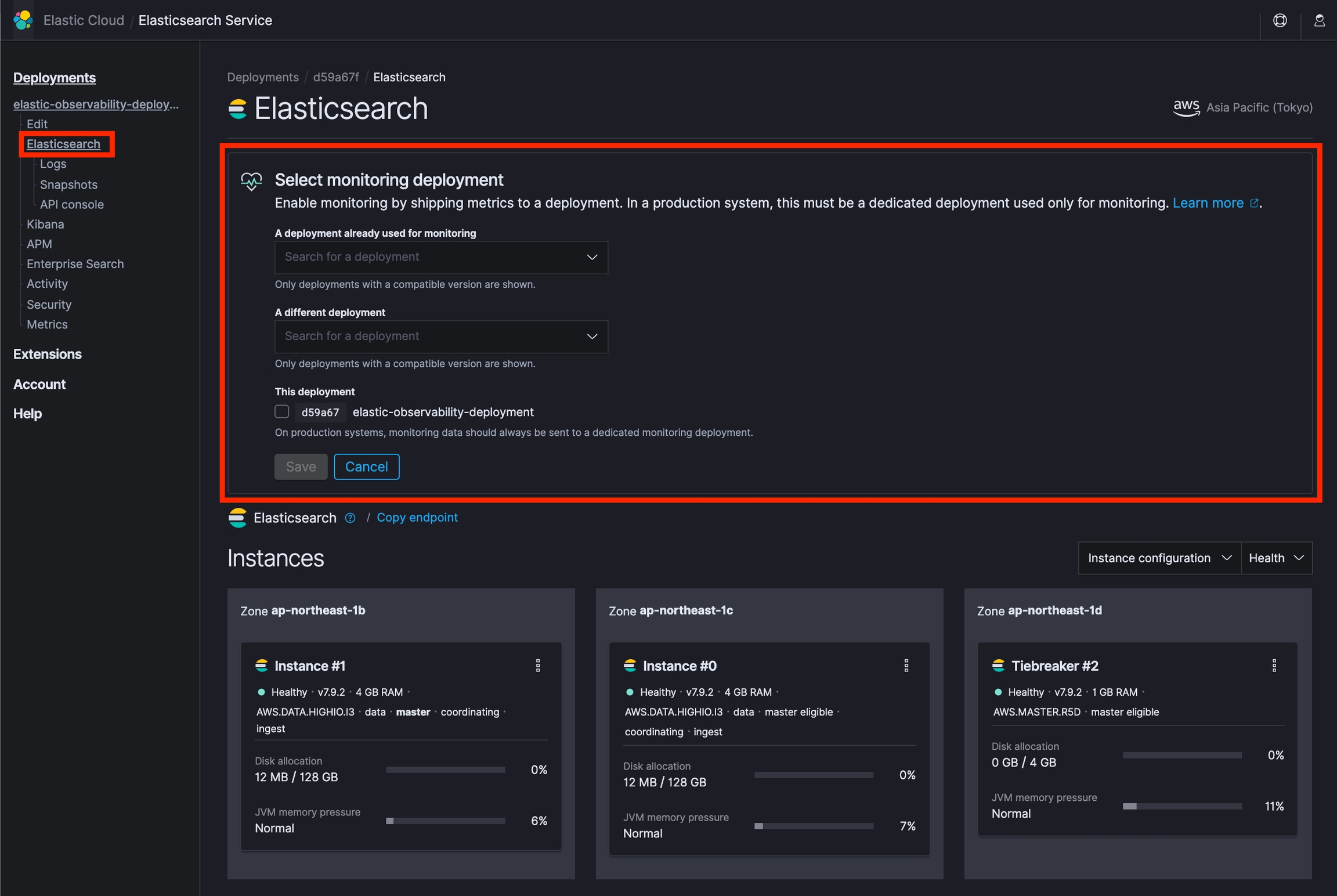 以下是在 Elastic Cloud 的 Elasticsearch 設定時,會看到 Monitoring deployment 的設定選項,其中也明確的建議 Production 環境要記得將 Montoring 的任務安排給一組特定的 Deployment 來管理。