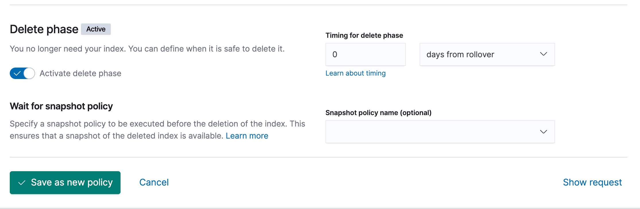 Delete Phase 的設定很簡單,就是要在 index rollover 發生多久之後 (若沒有啟動 Rollover,則是以 Index 建立的時間來判斷),要刪除這個 Index。