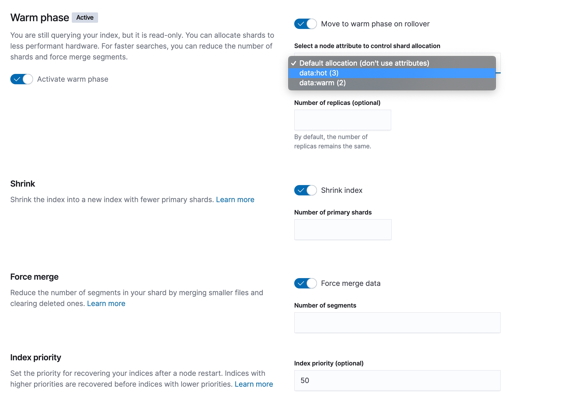除此之外可以指定 Shrink, Force merge, Index priority 等設定。