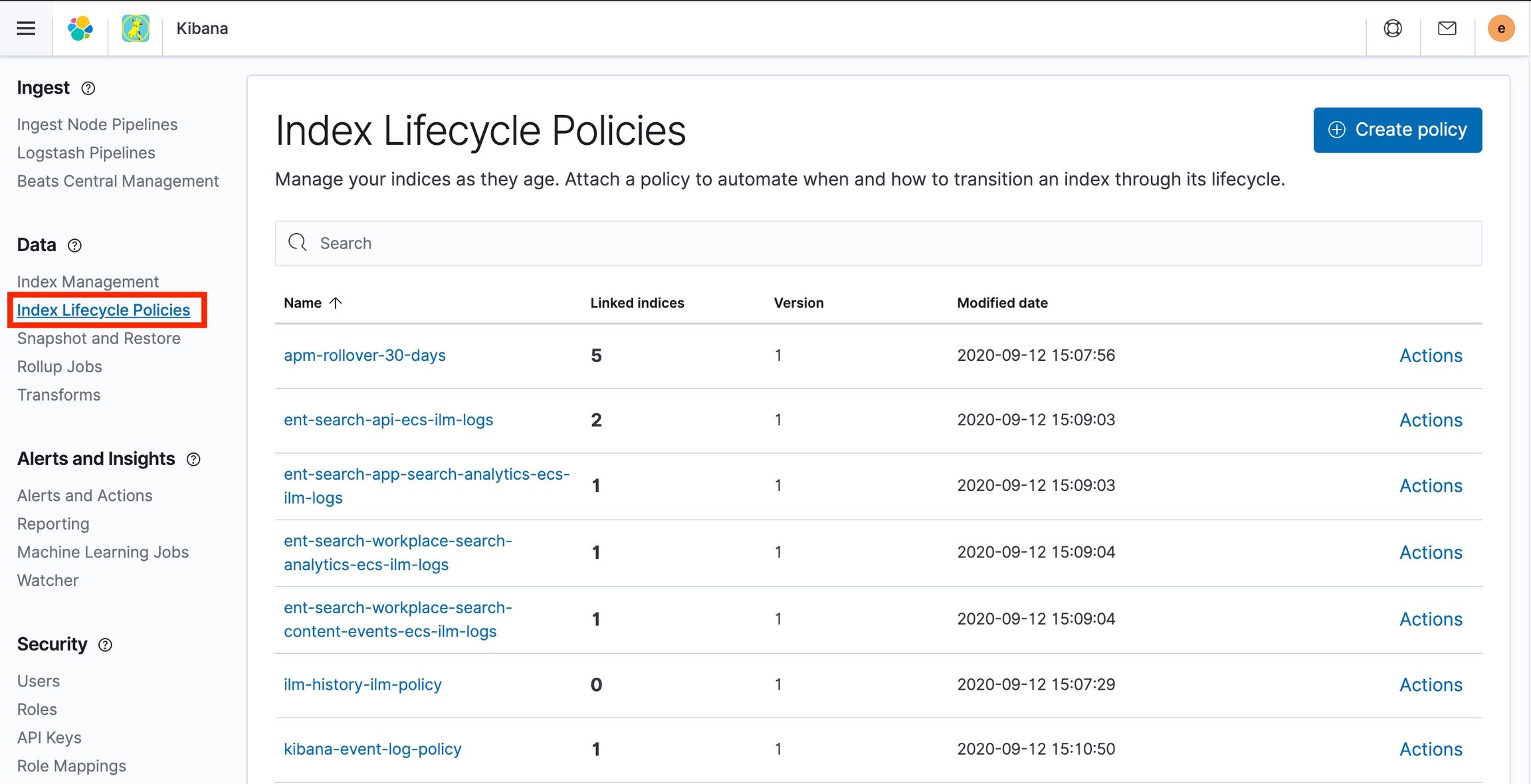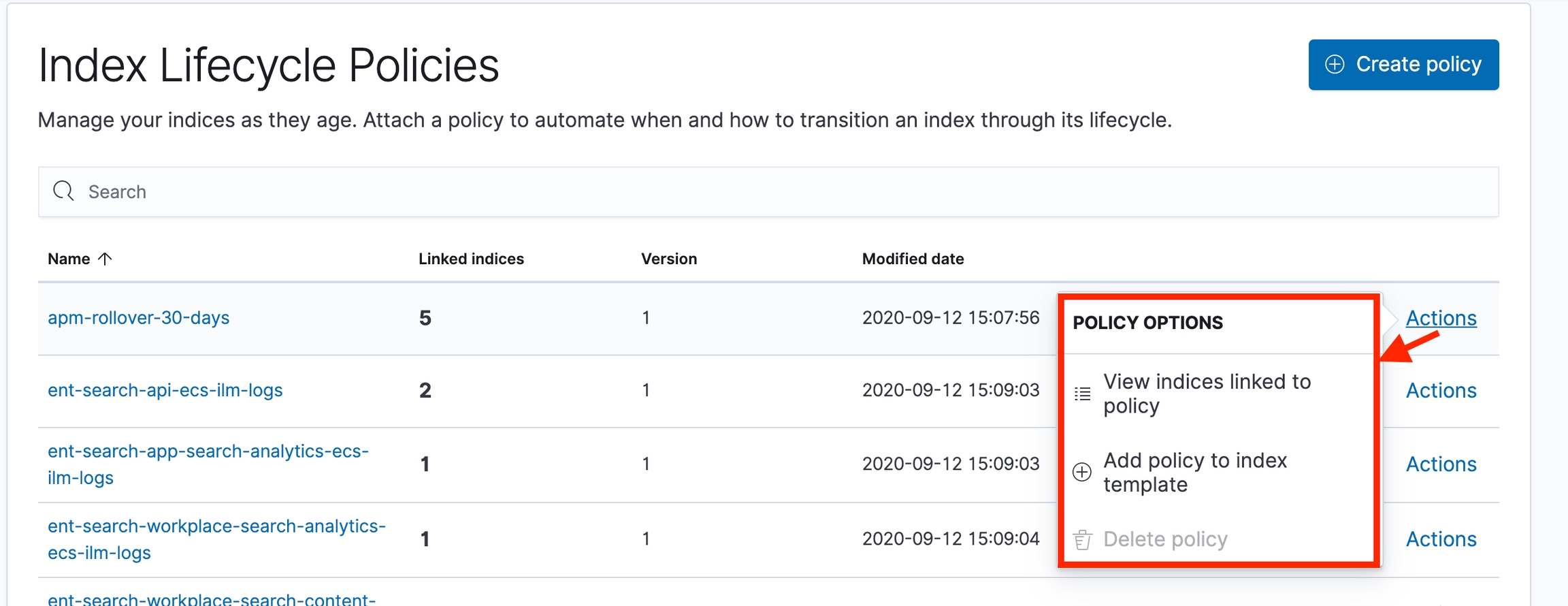 當我們 Index Lifecycle Policy 設定好之後,在主畫面的 Actions 可以看到有兩個設定。