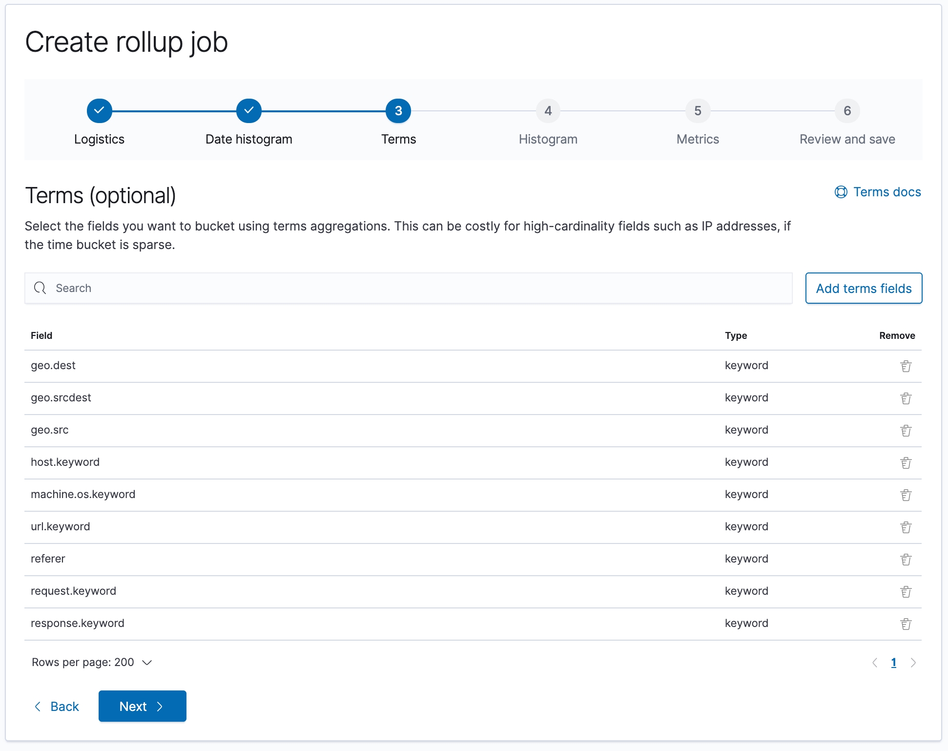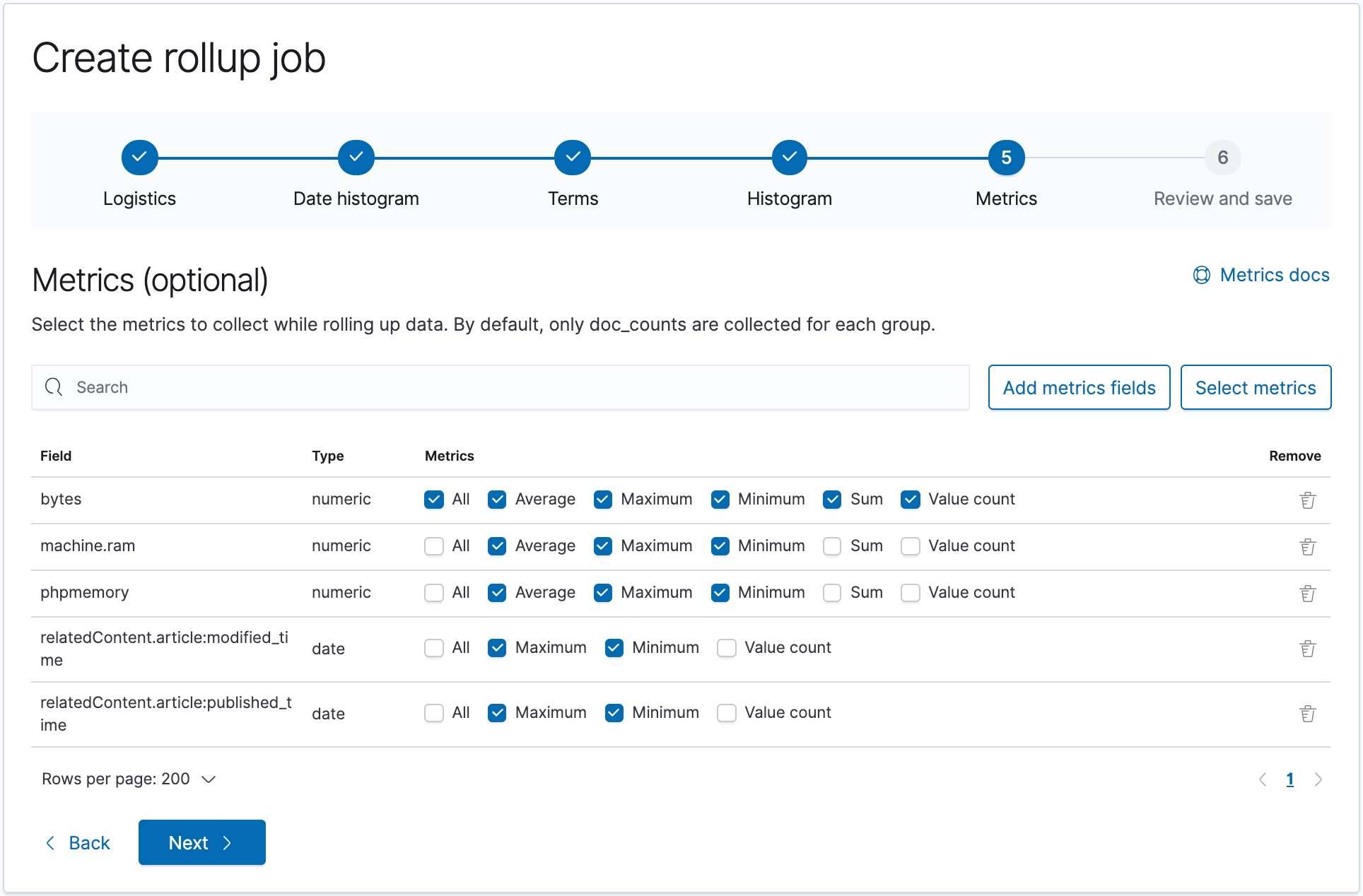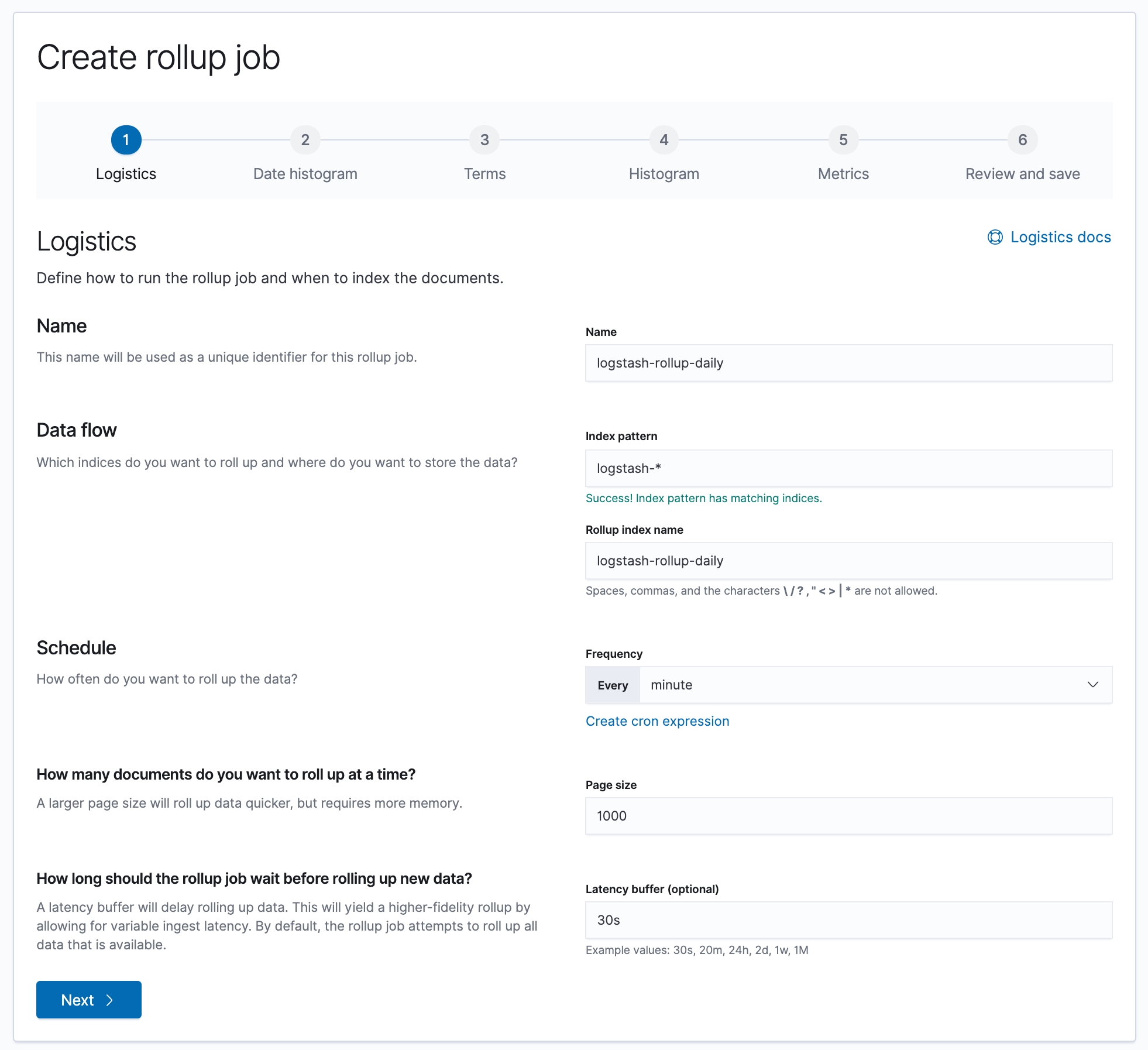 How long should the rollup job wait before rolling up new data: 在執行 Rollup 時,可以設定一個 Latency 執,這個 Latency 指的是資料在 ingest 進入 ES 時,有可能會有一些延遲 ,一但設了這個 Latency,Rollup Job 就會多等到 Latency 的時間過了之後,才會處理這部份的資料。