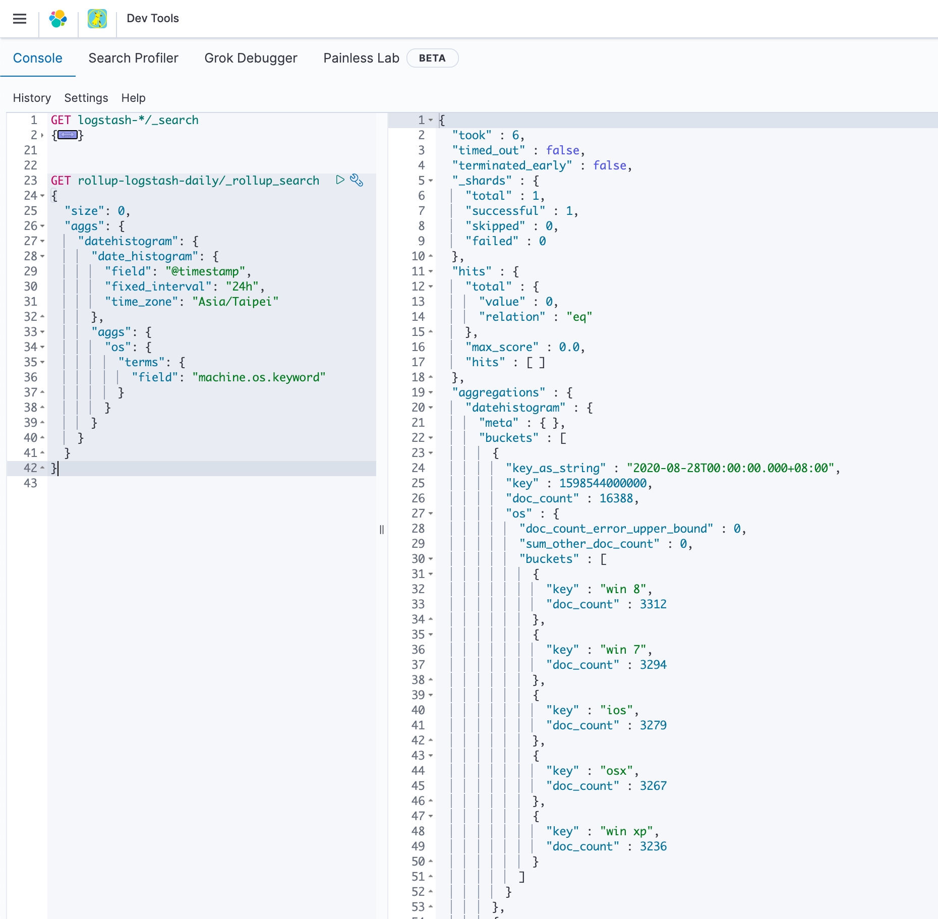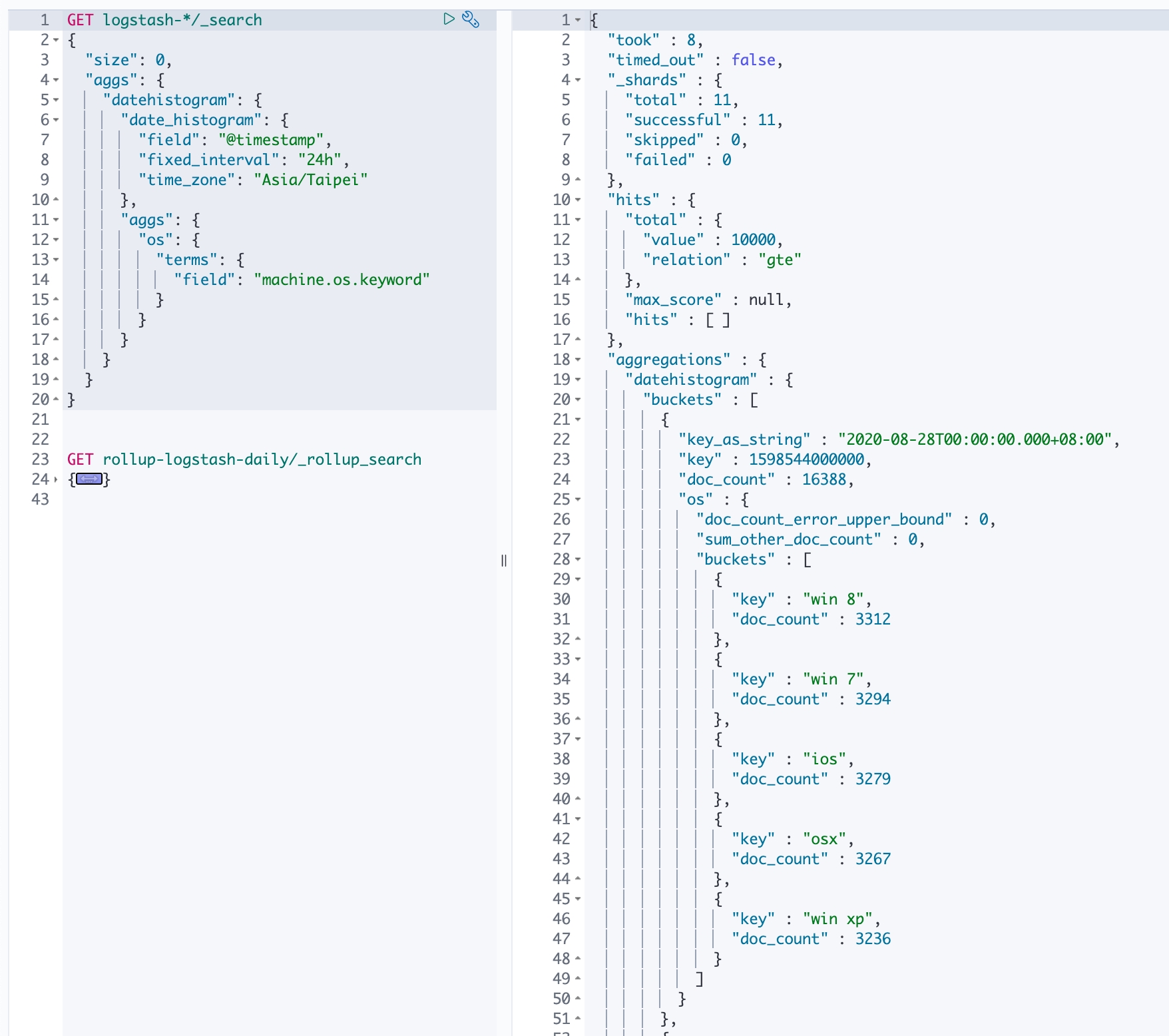 的結果會是長得不一樣的文件,也因此 Rollup 後的資料,若是要進行 search 時,要使用 _rollup_search