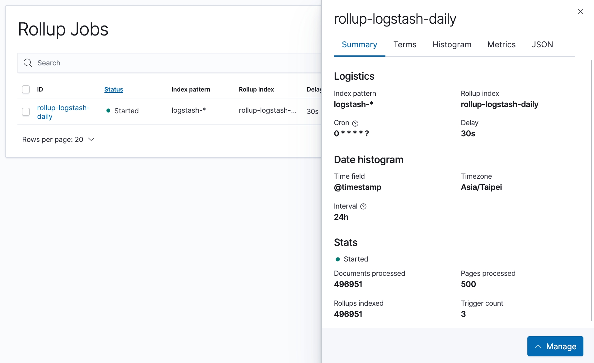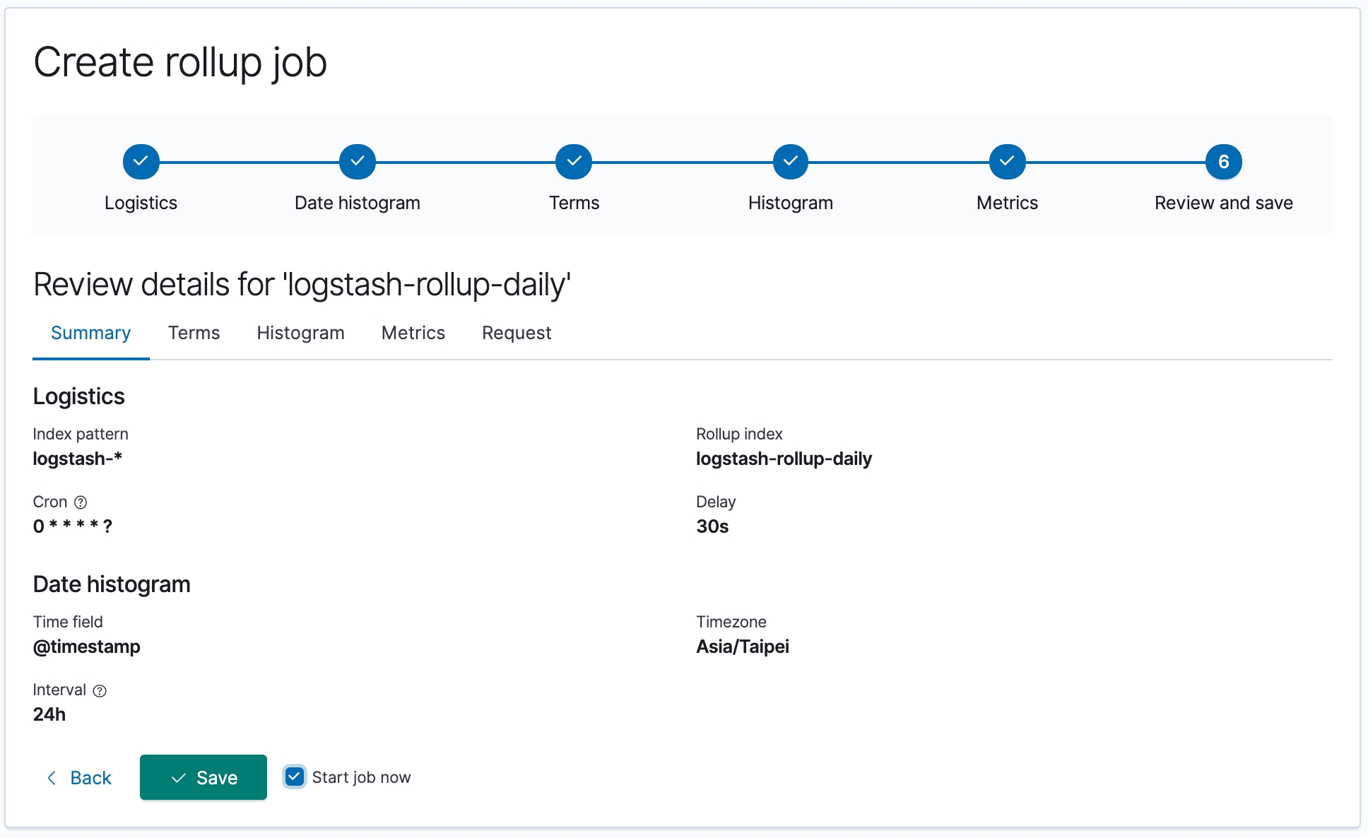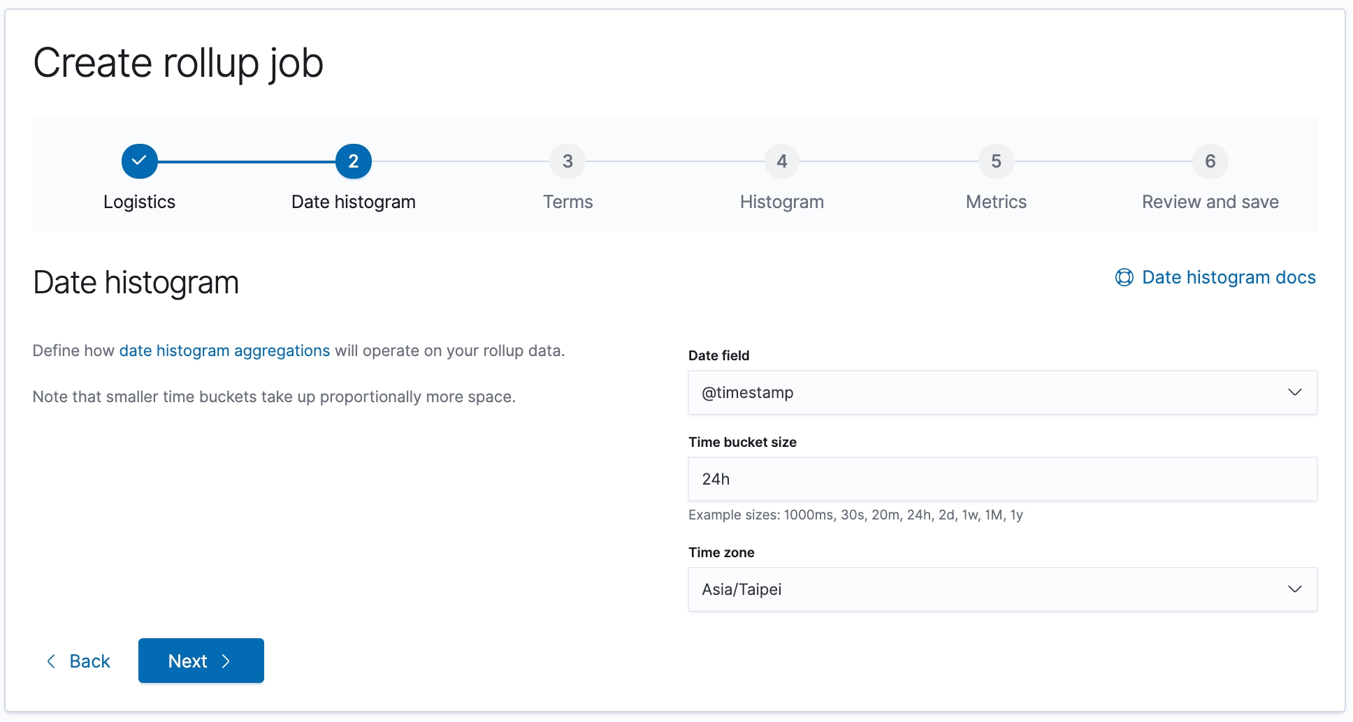 。若是在建立 Rollup Job 時有指定時區的話,在使用 Date Histogram 時也一定要指定同樣的時區。