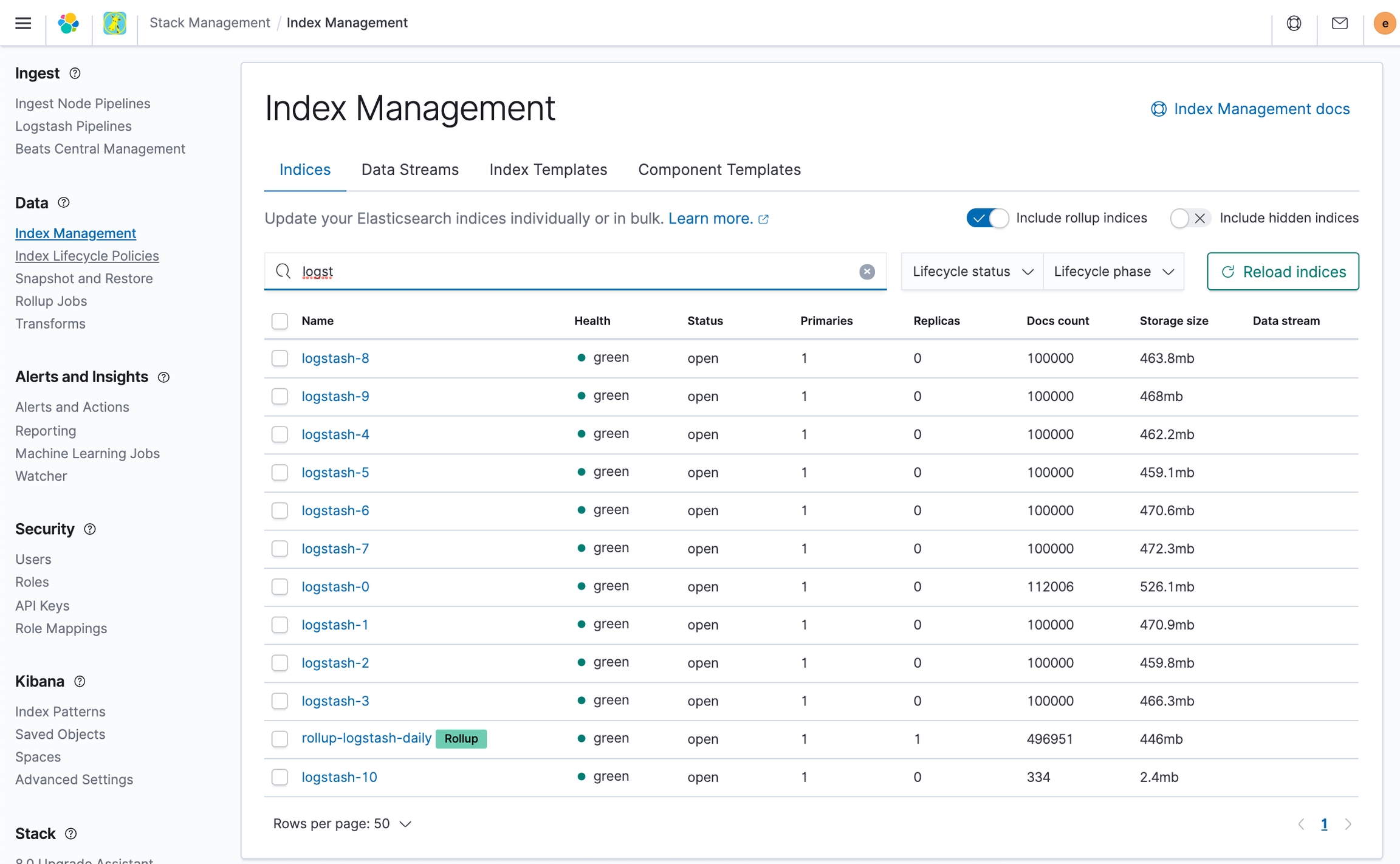 這時到 Index Management 來查看 Elasticsearch 中的 Index,就可以看到由這個 Rollup Job 所產生的 Index 了。
