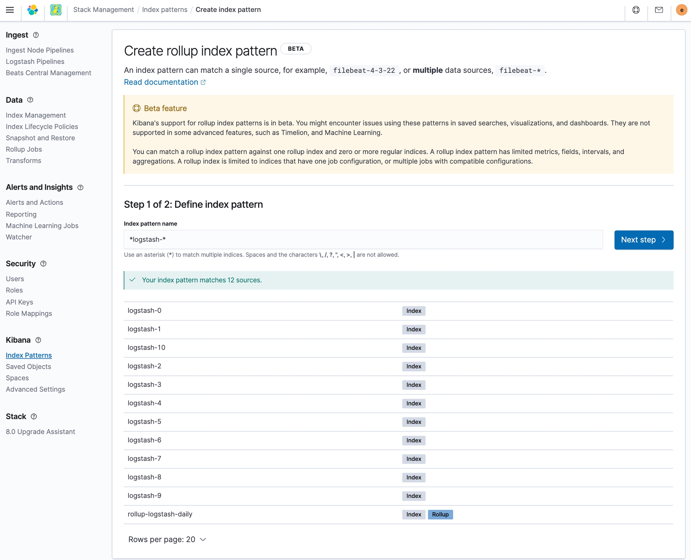 在 Kibana 中,若要使用 Rollup 的資料,要特別建立一個 Rollup Index Pattern