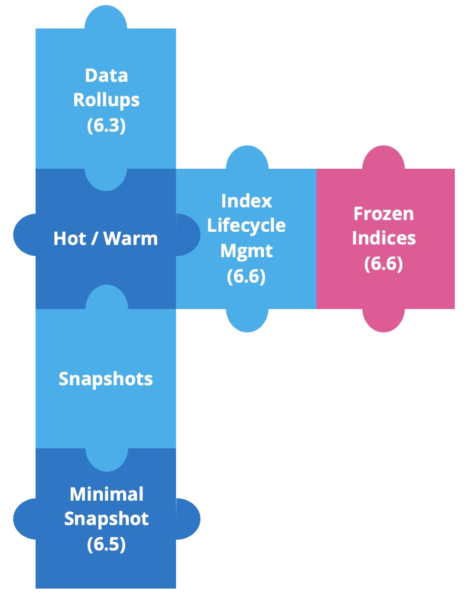 針對 time-based 的資料,Elasticsearch 在 5.x 版的時候,就提出了 Hot-Warm 的架構,主要是針對 常用的資料 與 時間較久也就是不常用的資料 分開用不同的硬體來存放,以達到資源有效的利用,不過從 Elastic Stack 6.3 開始,陸續在接連的幾個版本中,針對 time-based 資料的管理機制,提供了更全面的解決方案,就像是以下的拼圖,拼湊得更加完整了,從這篇開始,我們會陸續的做相關的介紹。