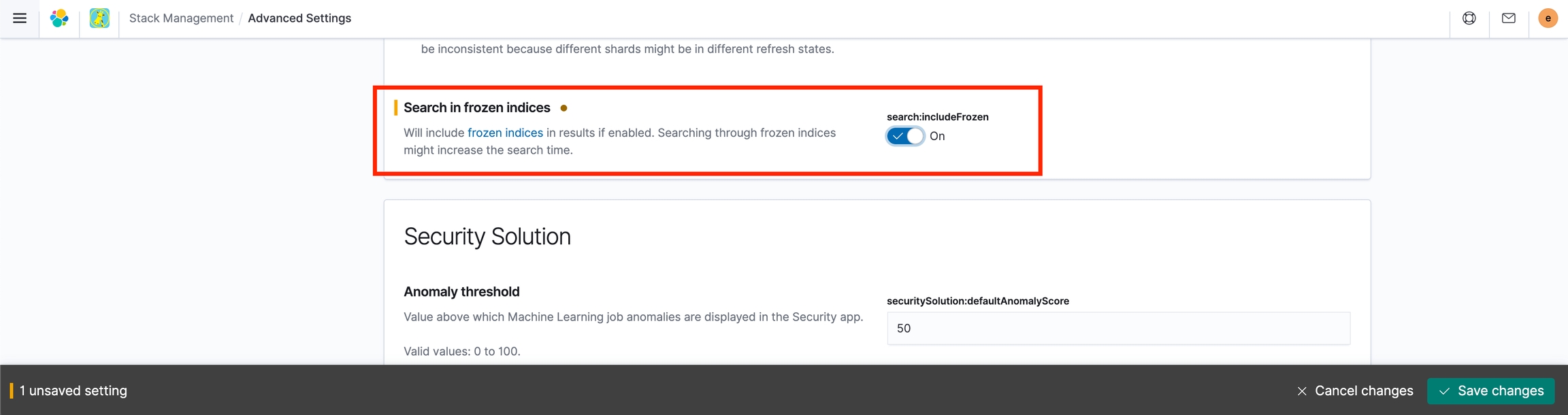 左滿 Menu 選單底下的 Stack Management > 找到 Kibana 區塊裡的 Advanced Settings > 找到 Search 區塊裡的 Search in frozen indices 並設定成 On。