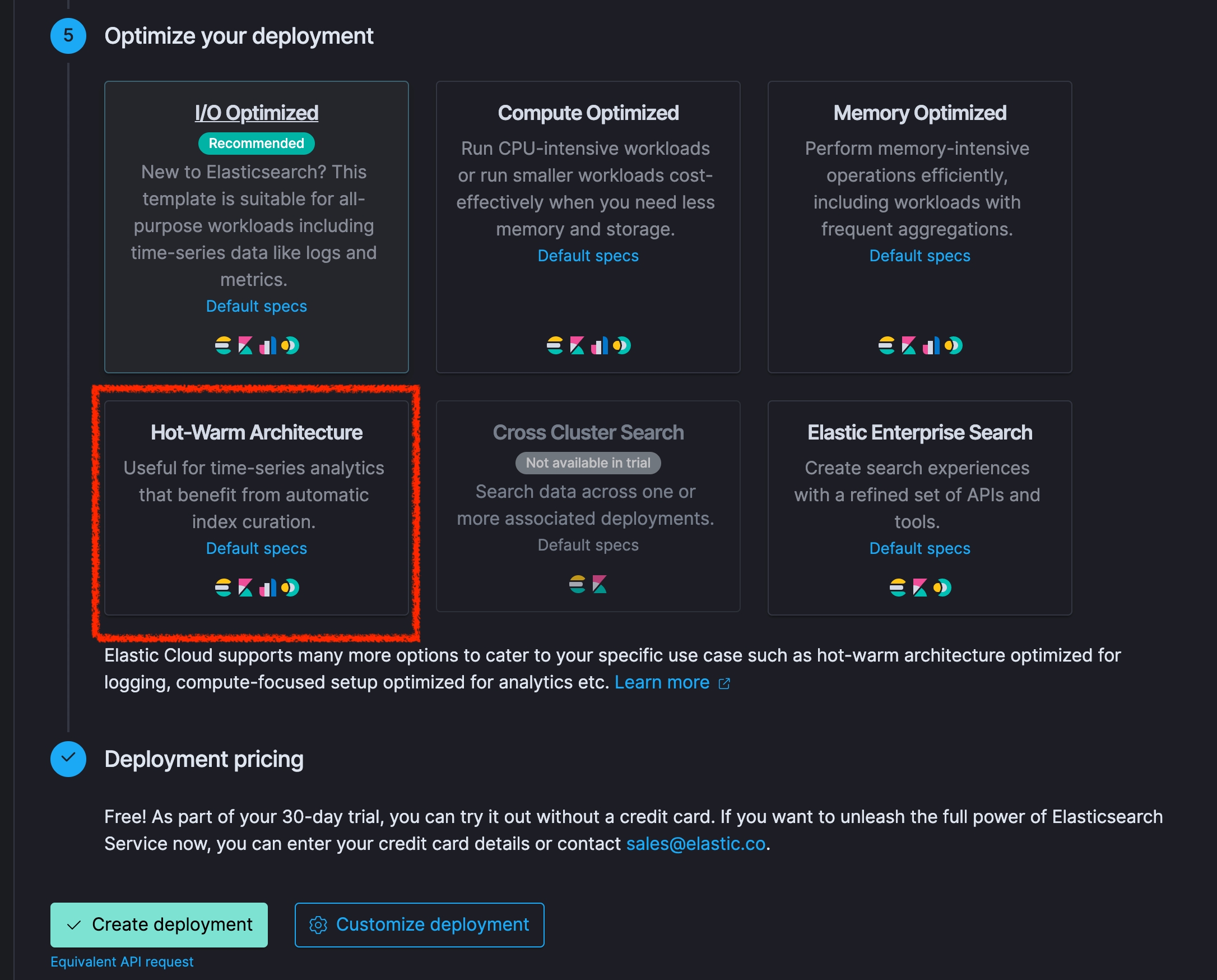 當你要建立 Hot-Warm Architecture 時,若是使用 Elastic Cloud,在 Deployment 的階段就有這個配置可以選擇,但是明眼的一看,他只有 Hot-Warm 並沒有 Cold,這是因為實際上機器的配置,並沒有特別針對 Cold 的配置來安排機器,至少這是目前在 Elastic Cloud 上還沒看到的。