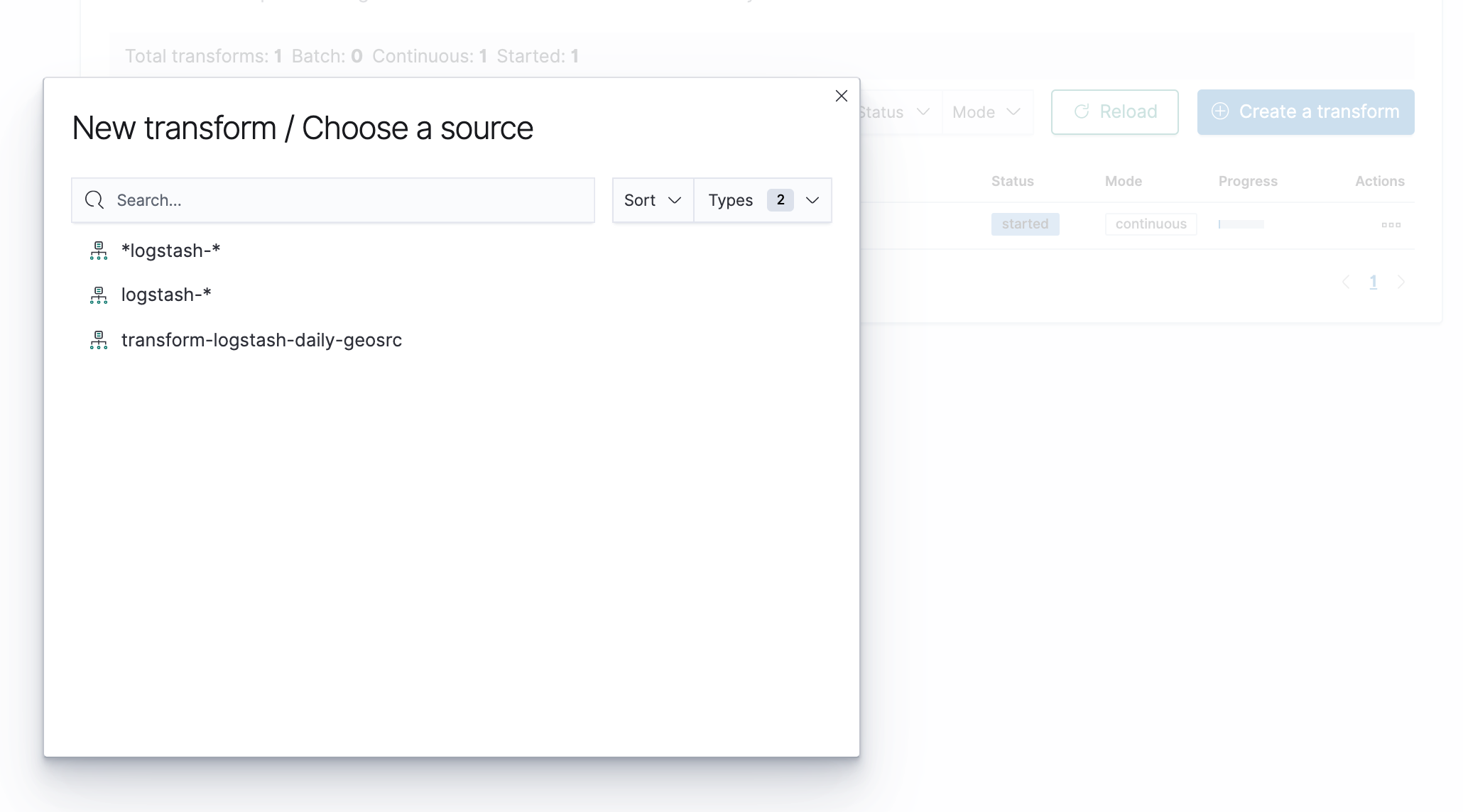 建立 Transform 時,第一步會要選擇資料的來源,這邊會需要先在 Kibana 建立好 Index Pattern。