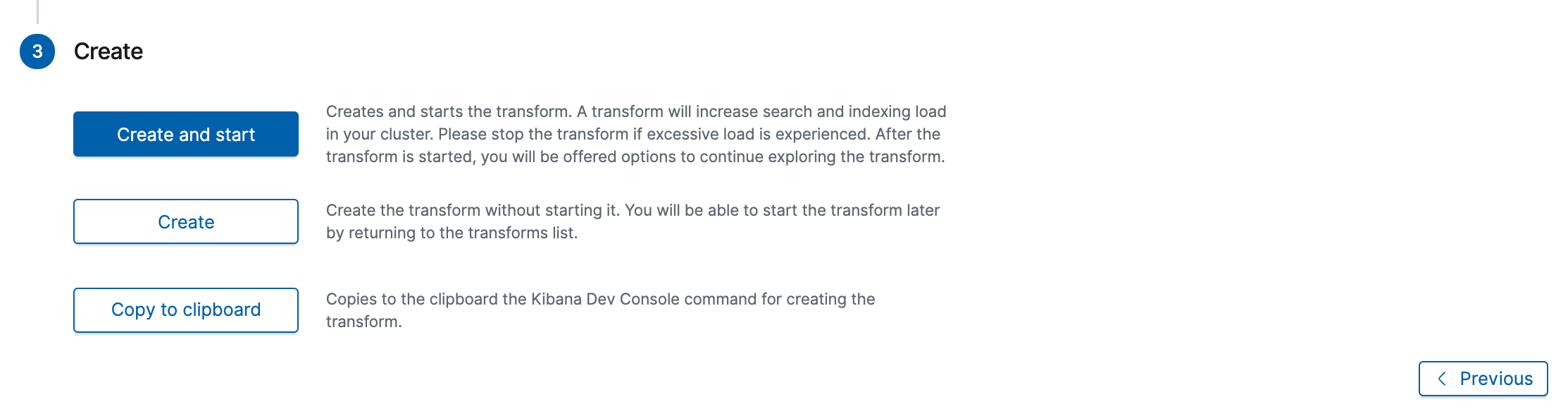 一切就緒後,就是執行 Create and start ,若好奇這個 UI 產生出來的 Create Transform API payload 長什麼樣,也可以選擇 Copy to clipboard ,並貼到 Kibana Dev Tools 去執行。
