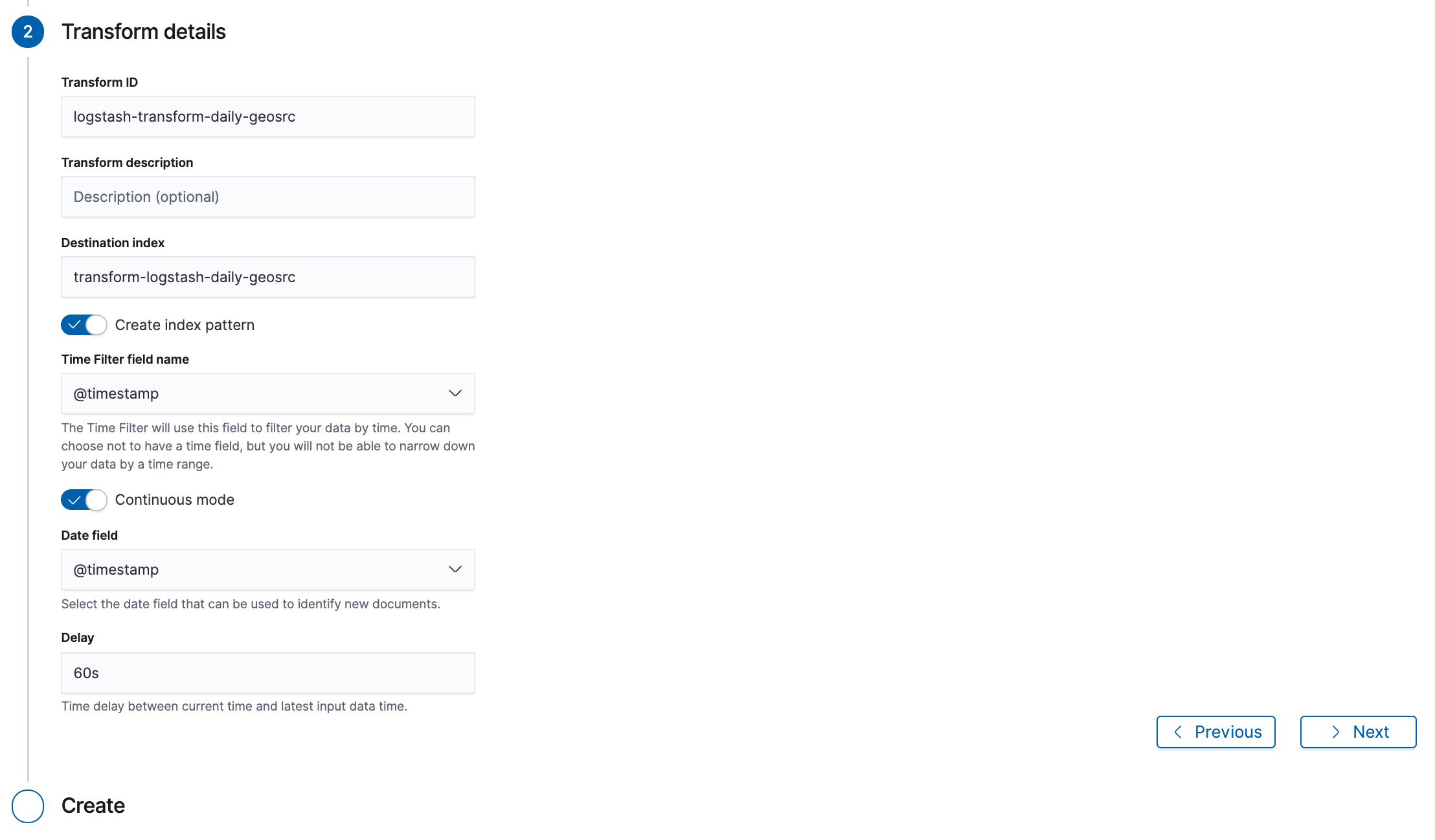 確認資料彙總的方式沒問題後,接下來設定 Transform 的基本資訊,包含 Transfor ID, 產出結果存放目的地 Index 名稱,若是有選擇時間的 Group By 條件,也會要指定 Time Filter field name,再來指定 Date field 用來判斷資料是否有更新,最後是 Delay。