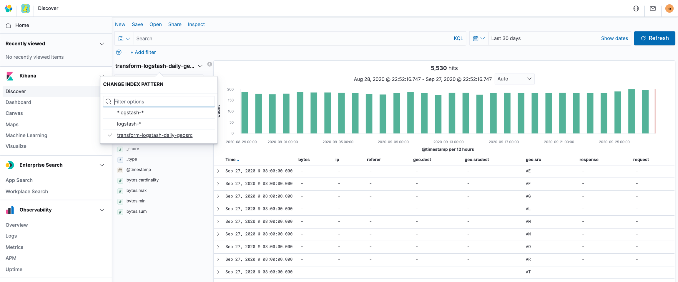 若我們進入到 Discover 頁面,可以發現從 Kibana 建立的 Transform 自動也建立了 Index Pattern ,所以可以直接選擇這個 Index Pattern 來瀏覽資料。