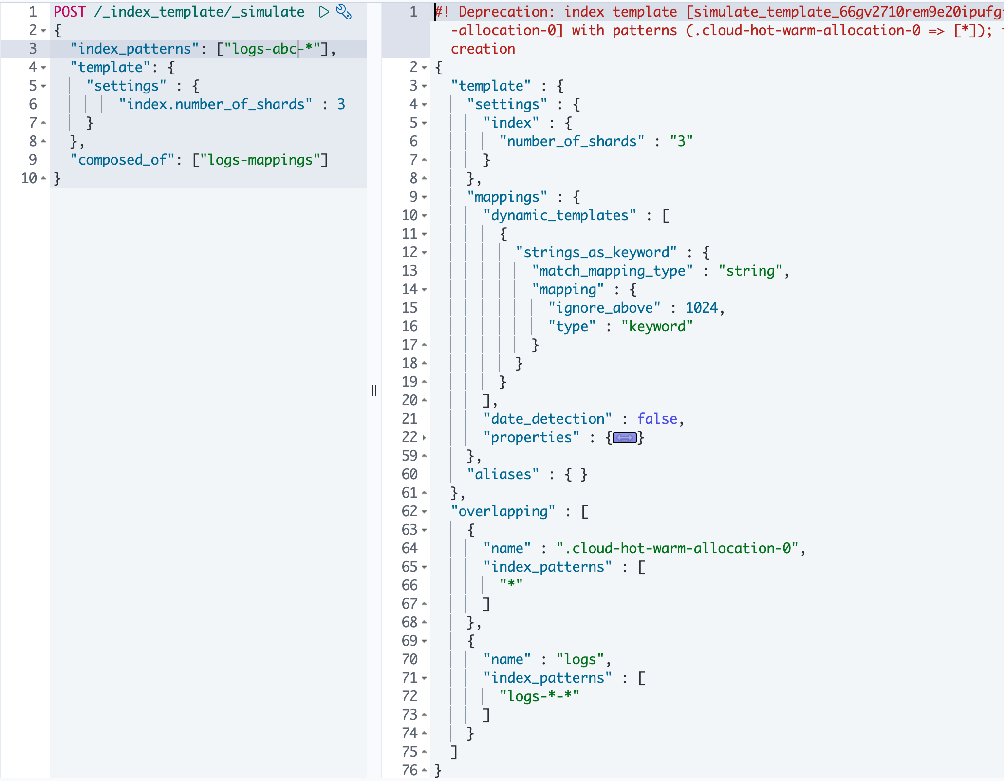 Simulate Template用途:當建立這個 Template 後,若有一個 Index 因為這個 Index Template 而建立起來時,裡面的設定會長什麼樣子,以及是否有與其他同規則發生重疊的 Template。