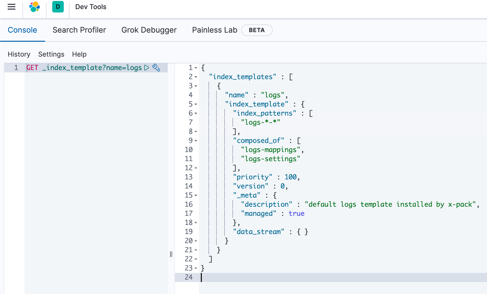 logs從 _index_template API 可以直接 get 到這個內建的 logs index template.