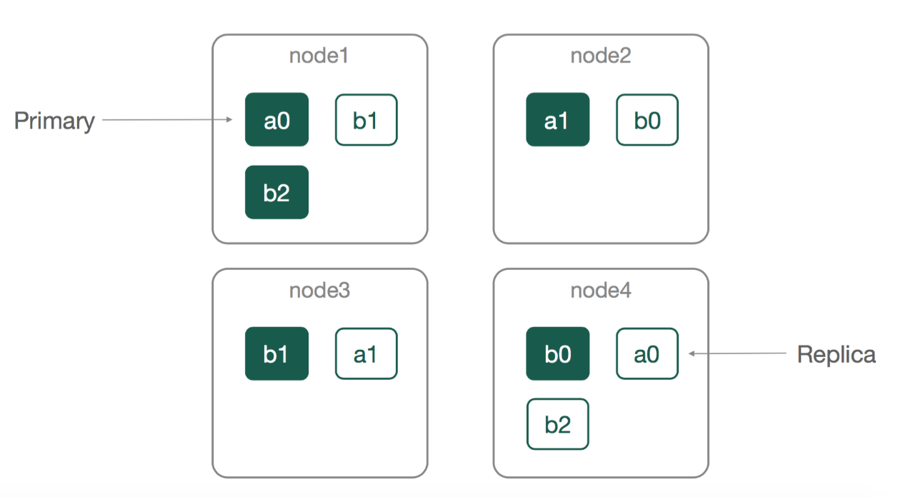 a, shard: 2, replica: 1 (有a0,a1兩個深色的 primary shard, 另各有一份白底的 replica shard)index: