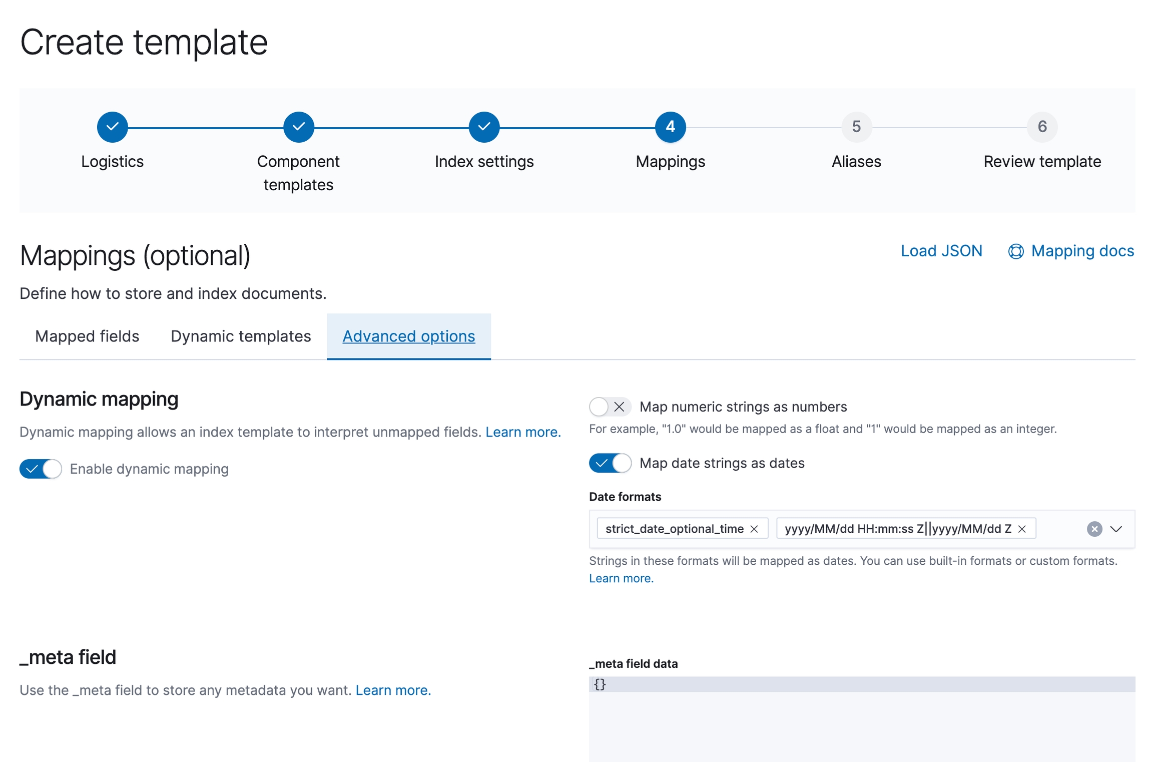 在建立一個新的 Index Template 時,我們先前介紹的功能,也都能在畫面上直接操作、設定及產生,有一些部份還是需要告 JSON object 來宣告,例如:Aliases