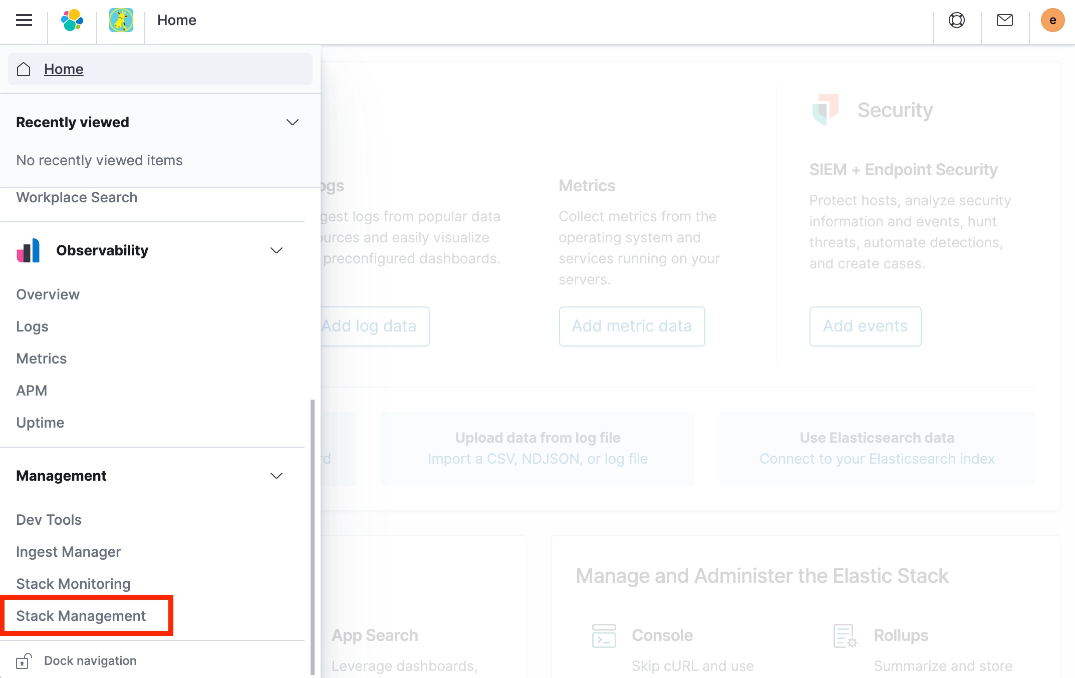 有些第一次使用 Kibana 的朋友,會被左邊落落長的功能選單搞得頭很痛,不知道從何進入我們 Index 的管理,請直接把左邊工作選單展開,拉到最底下的 Management 的區塊,選擇 Stack Management。
