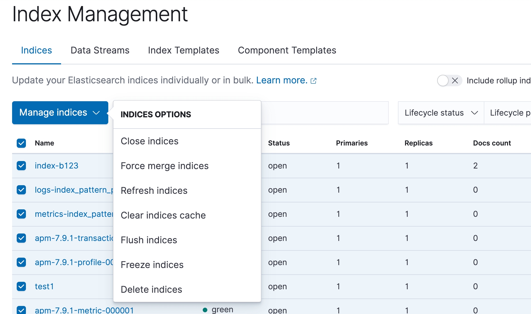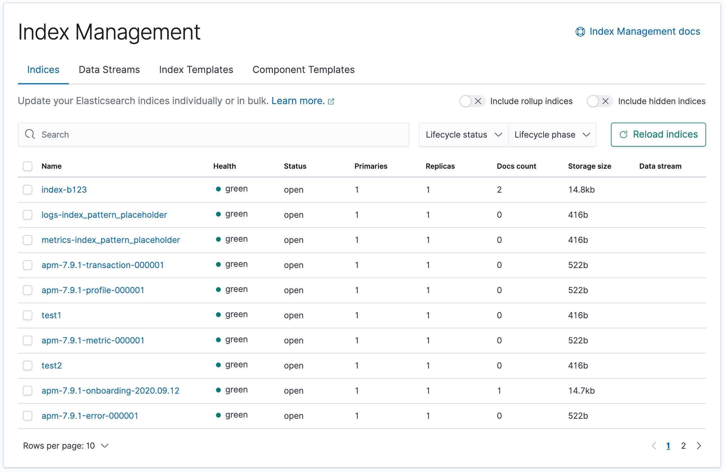 基本上 Index 的建立,還是必須透過 Create Index API,或是真的把一筆 Document indexing 進入 Elasticsearch 中,而由 ES 自動依照 Index Template 來建立 Index,這裡可以列出所有的 Index 及顯示他的基本資料。