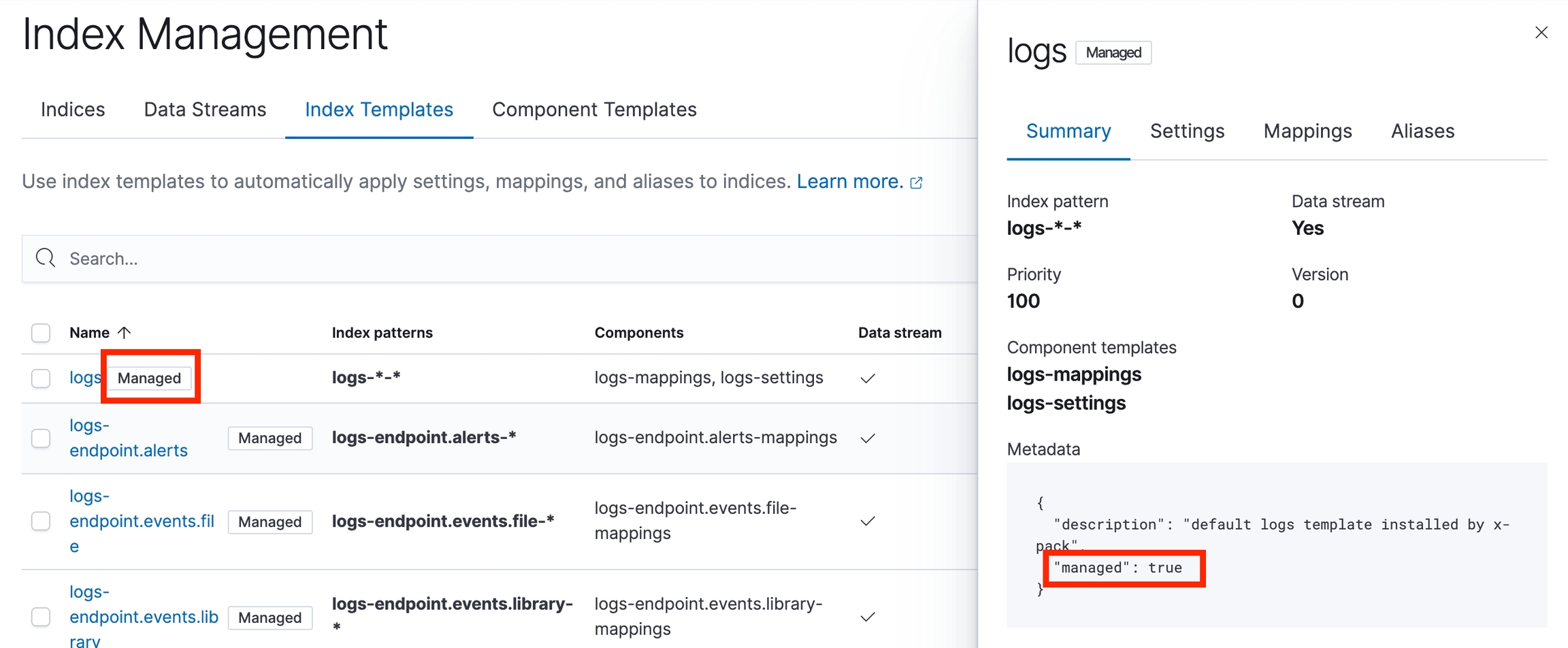 這裡要分享一個小技巧,在 Kibana 的 UI 上,會顯示這個 Index Template 是否是 Managed,而這邊會發現這個資訊其實是存在 Metadata