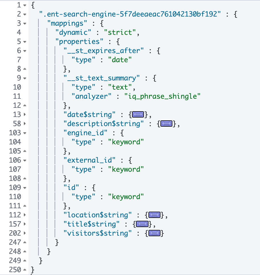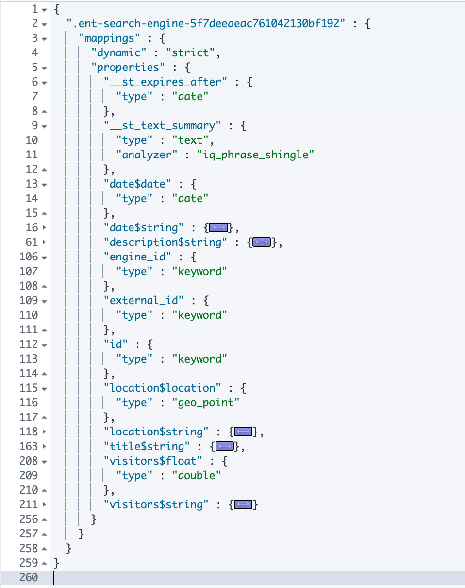 dynamic: strict: 這指的是關掉 dynamic mapping,也就是如果嘗試 indexing 一個 mapping 不存在的欄位時,會回傳錯誤並且 indexing 失敗,這也是一般進入 Production 環境時、而且資料欄位的增長是能控制時,較嚴謹的使用方式。一些 App Search 內部使用的欄位: