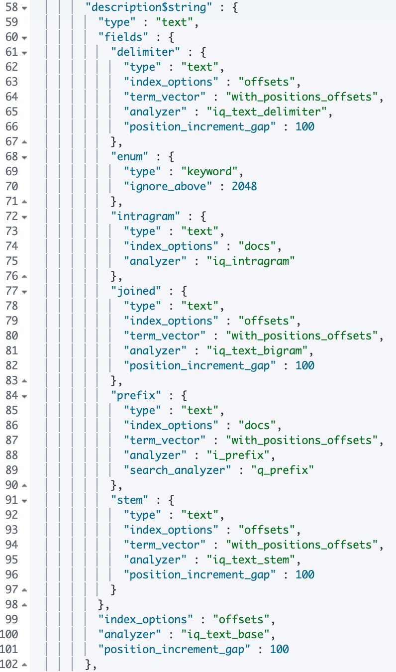 index_options: offsets: 這邊使用的offsets是index_options最詳細的設定。analyzer: 預設的 Analyzer 是iq_text_base,也就是 App Search Analysis 中,基本的文字處理 Analyzer。position_increment_gap: 這是處理 array 這種類型的多值的資料,拉開每個值之間的距離,提升這種多值的資料查詢的準確性。