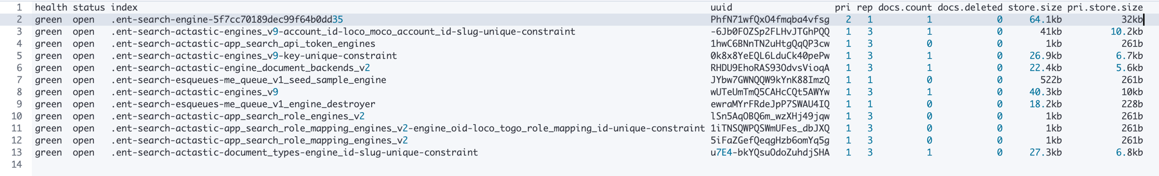 *-app_search_*字眼的:這些用途蠻明的,包含 app search settings, accounts, api_tokens...等,就是存放 App Search 一些 application data 用的。.ent-search-actastic-engine_document_backends_v2: 這個是存放了 backend level 會用到的 engines 的 meta 資料,有幾個 engines 就有幾筆 document,只有簡單的 engine 建立時間、engine id、是否可讀寫的狀態。.ent.search-actastic-engines_v9: 這裡存放的是定義每個 engines 的詳細資料。.ent-search-engine-*: 這個會是每個 engines 產生一個 index,裡面存放的就會是這個 engine 裡面的所有 document。