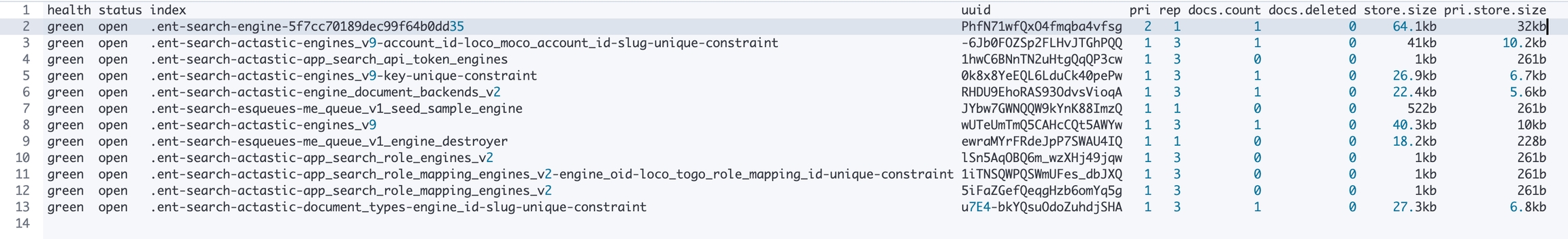 : 這個是存放了 backend level 會用到的 engines 的 meta 資料,有幾個 engines 就有幾筆 document,只有簡單的 engine 建立時間、engine id、是否可讀寫的狀態。.ent.search-actastic-engines_v9