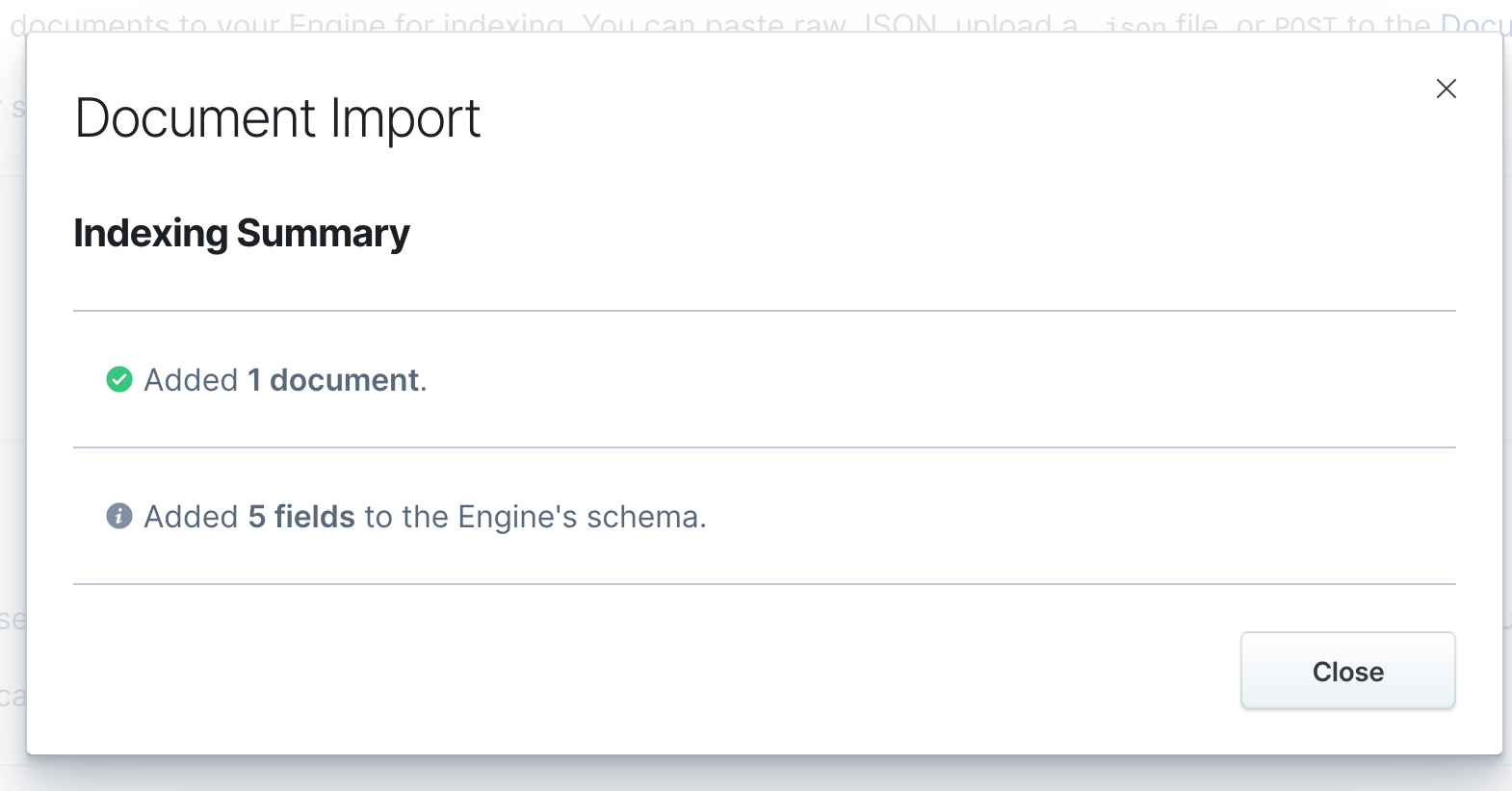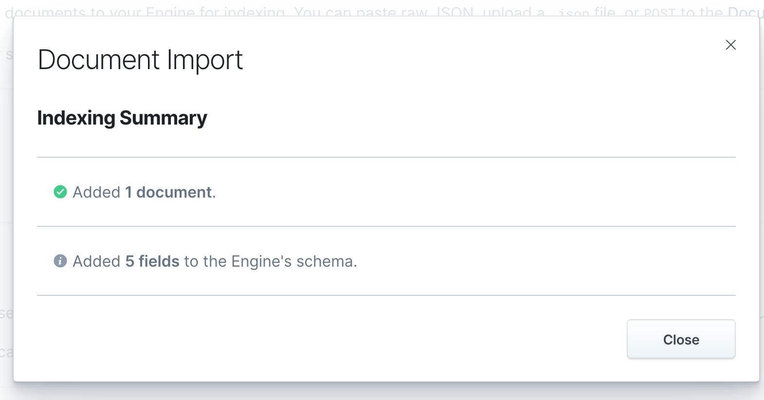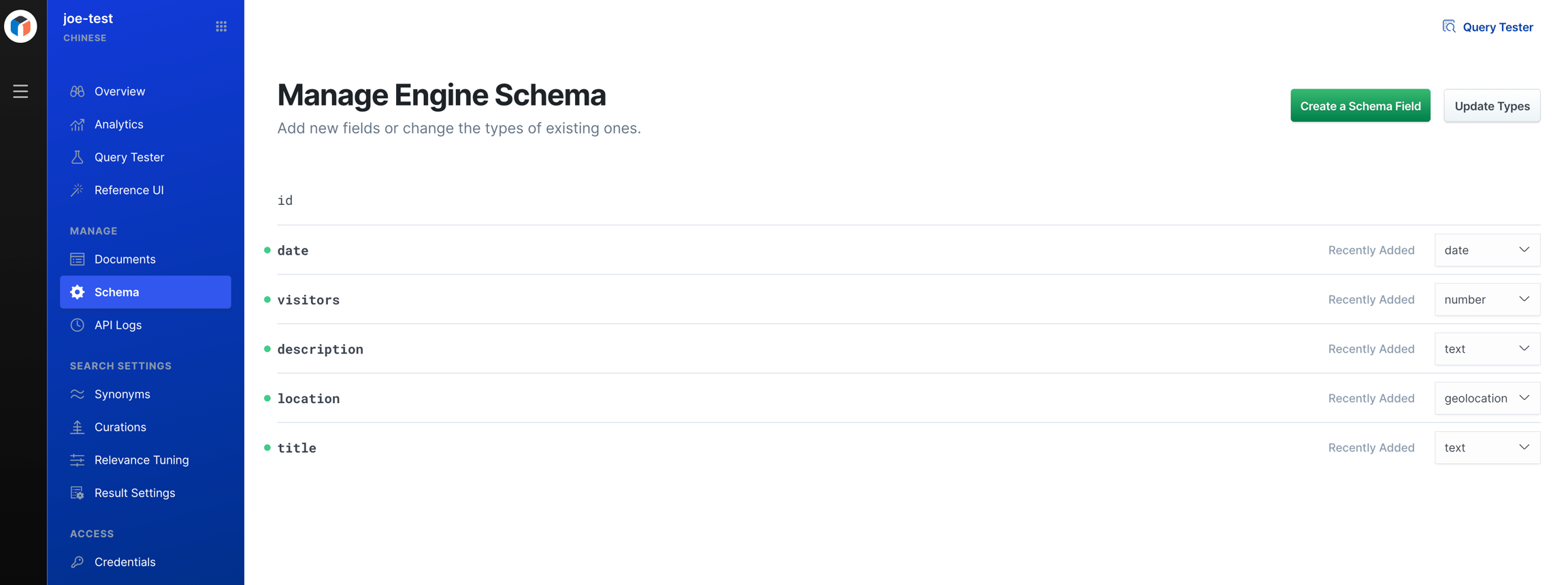 透過 UI Import 進 App Search 後,會看到 5 個欄位被加入說 Engine's schema 了。