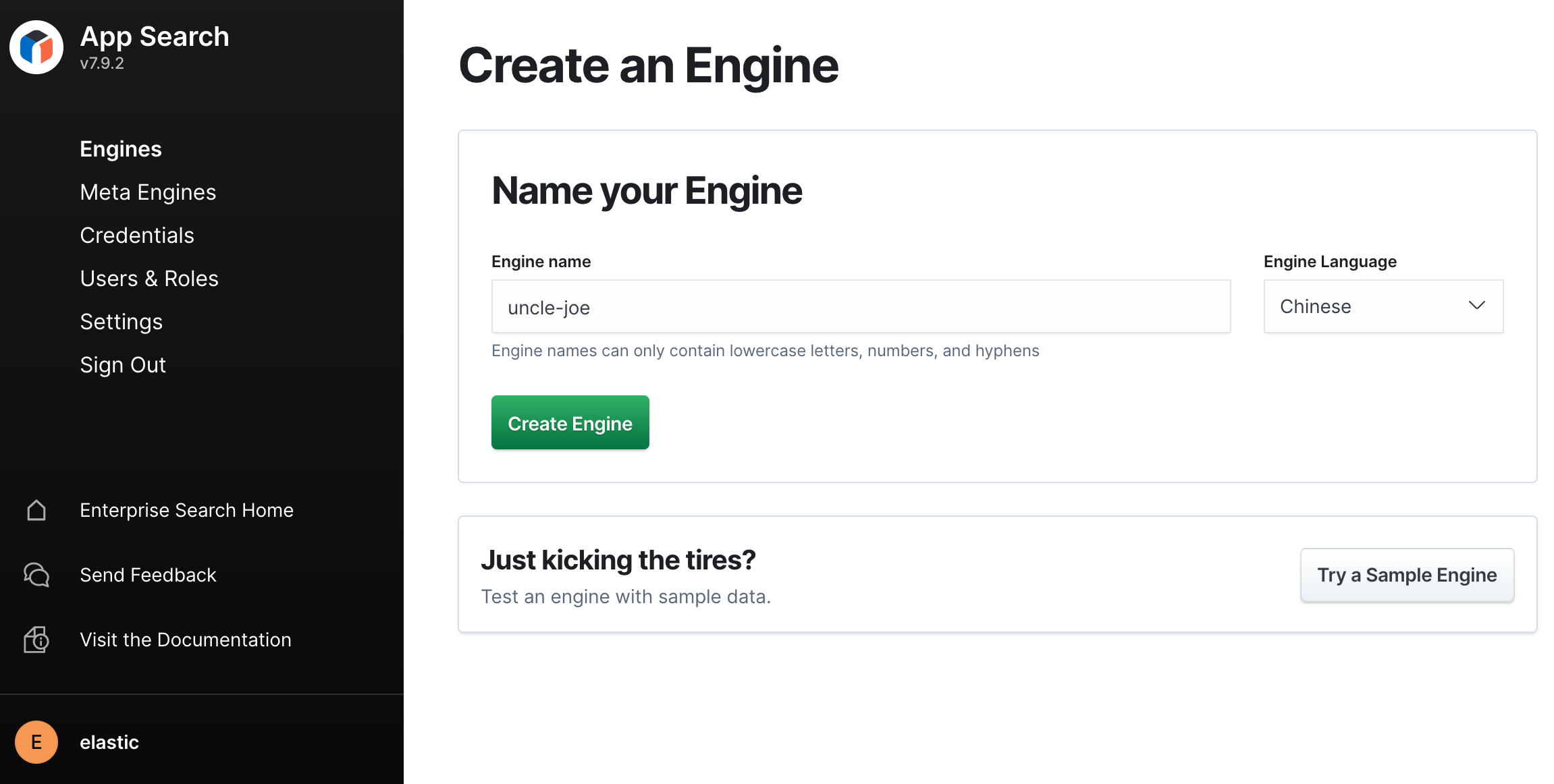 一開始我們 .ent-search-actastic-engines_v9 index 會是空的,所以我們透過 App Search UI 來建立一個 Engine。