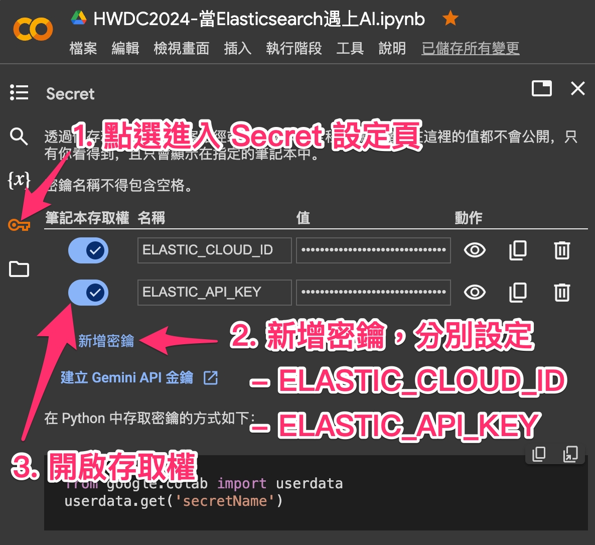 :::info 後續在 Colab 中進行 1. 準備環境 時,會需要透過這些設定,存取你的 Elasticsearch。 :::